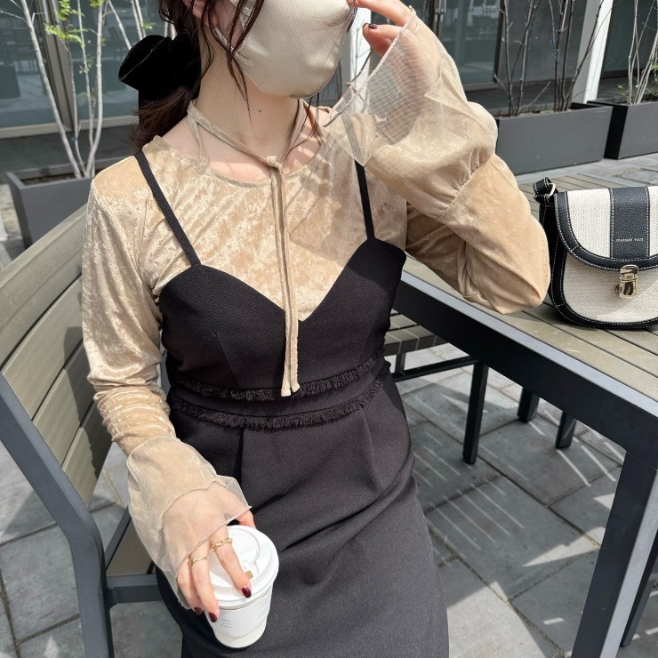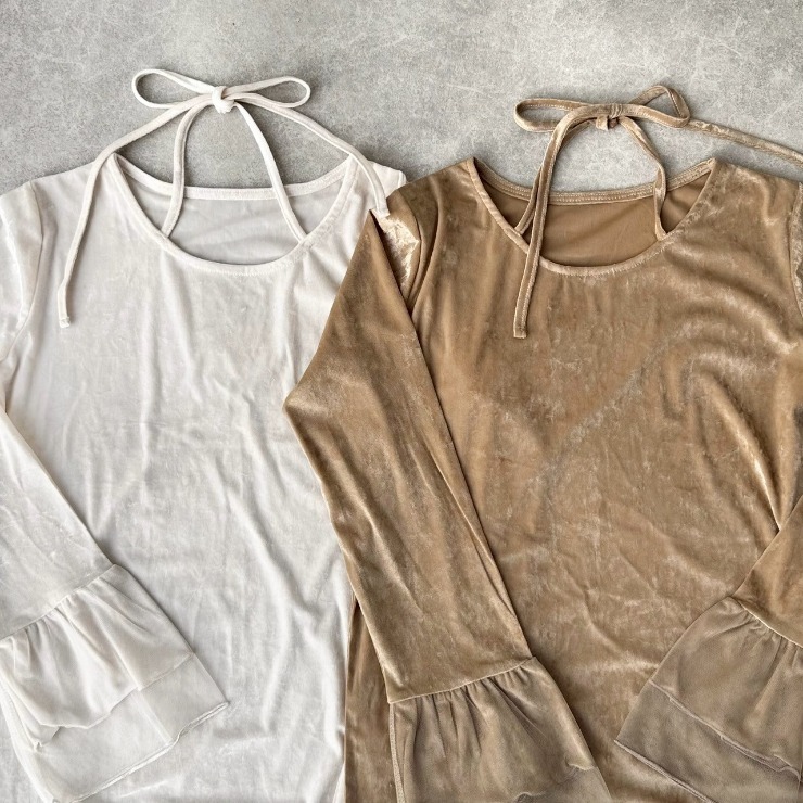 身頃にはほんのり光沢のあるベロア素材を使用し、上品さと抜け感を両立。