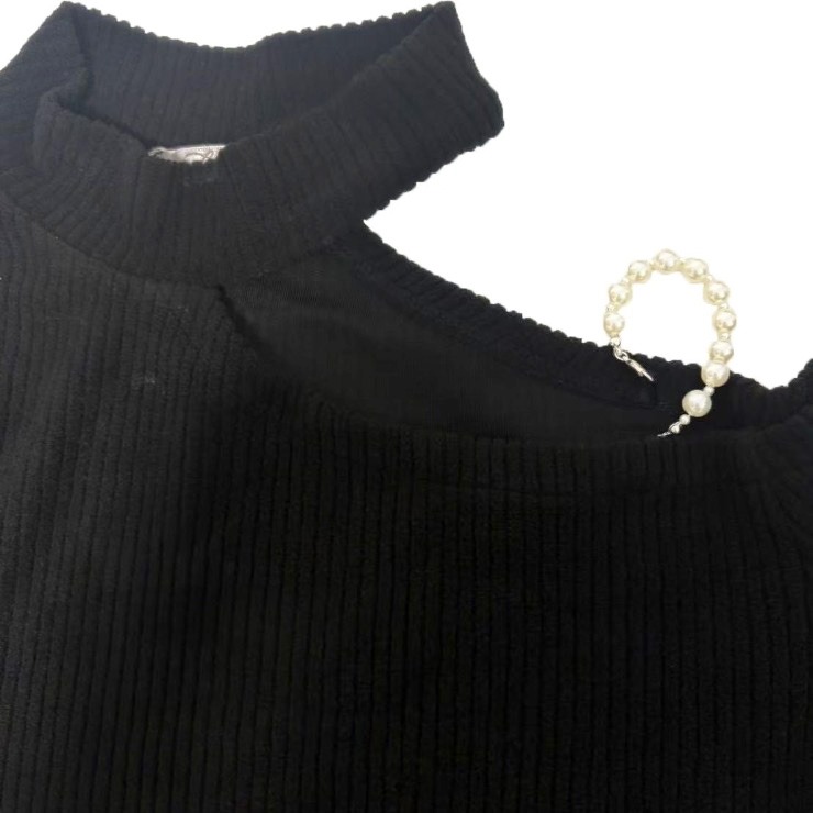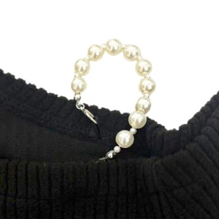 アシンメトリーネックから見える肩にパールチェーンの紐が光る女性らしいトップス。マーメイドスカートやナロースカート、パンツなどどんなボトムとも組み合わせられる着回しの効く万能アイテム。
