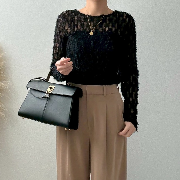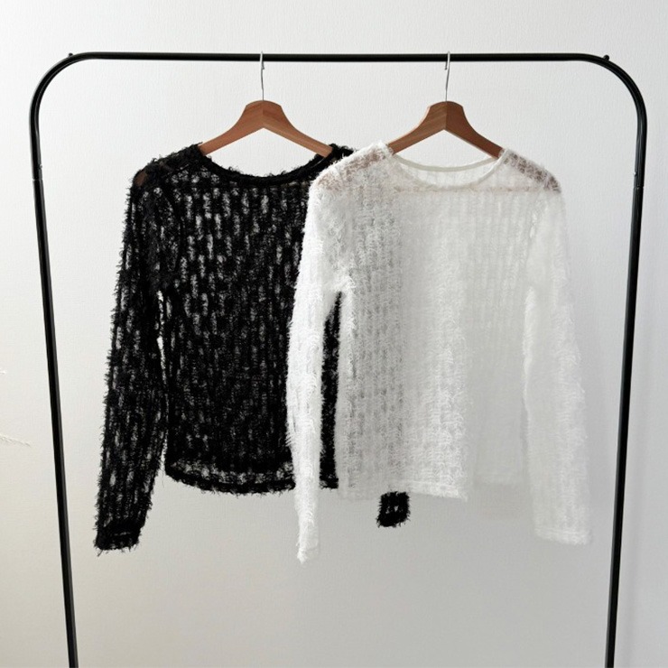 インフルエンサー「misato」さんとのコラボアイテムです。毛足のあるシャギー素材なのに、透け感があるのがオトナ可愛い♪オンでもオフでも着回しやすく、春先・初夏まで大活躍間違いなし!