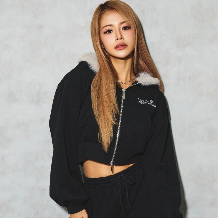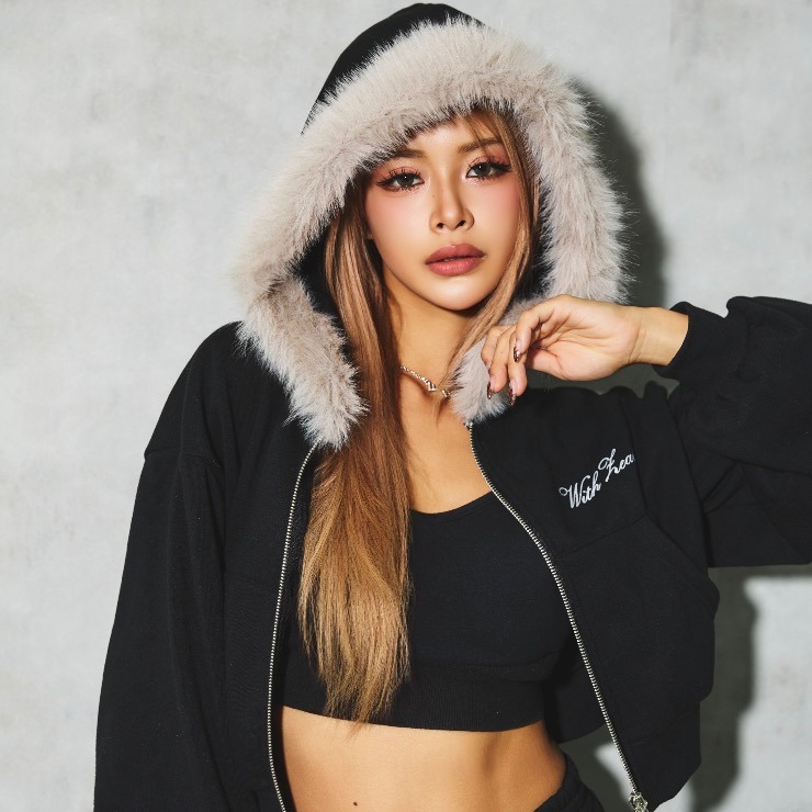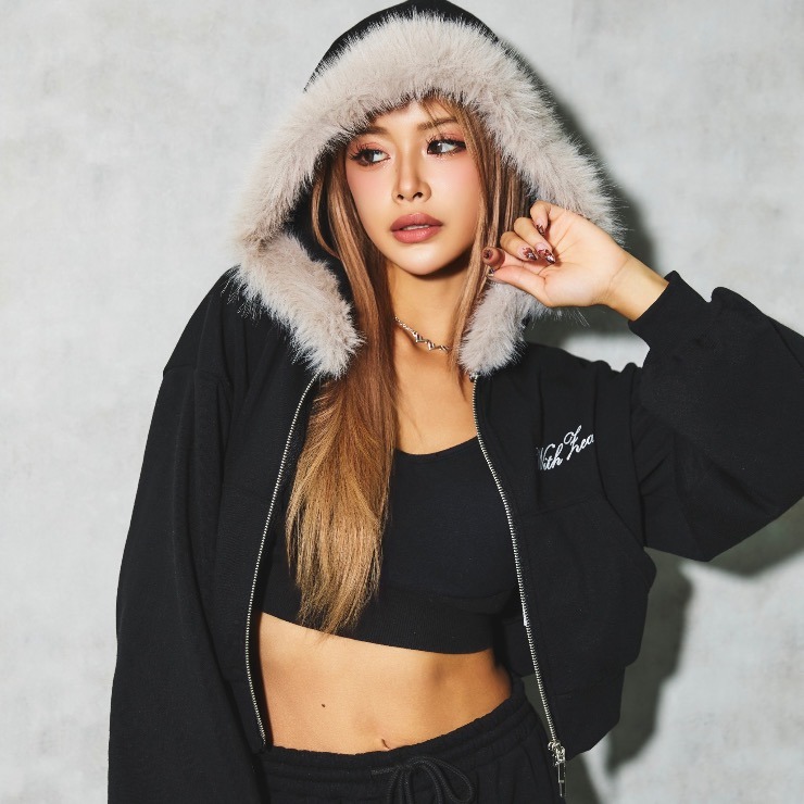 ボリュームのあるフェイクファーをフードにあしらったジップアップフーディ。