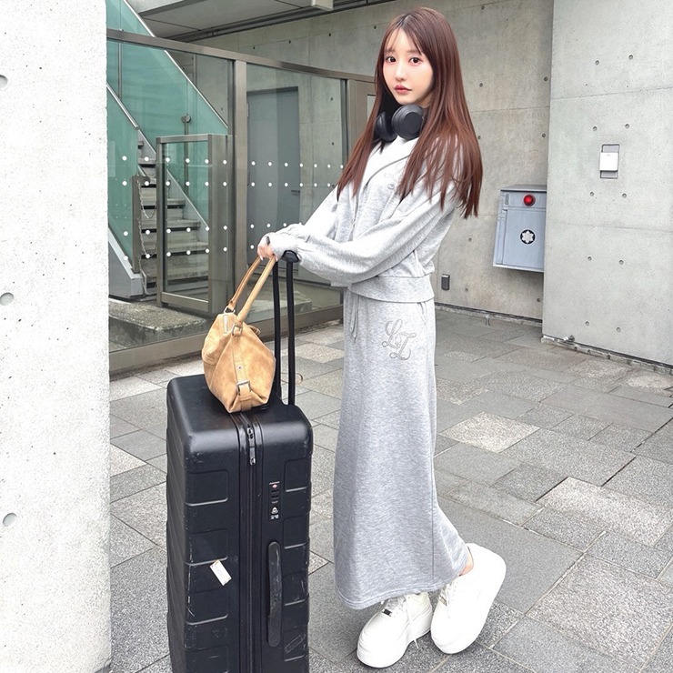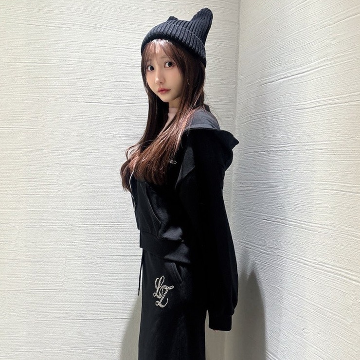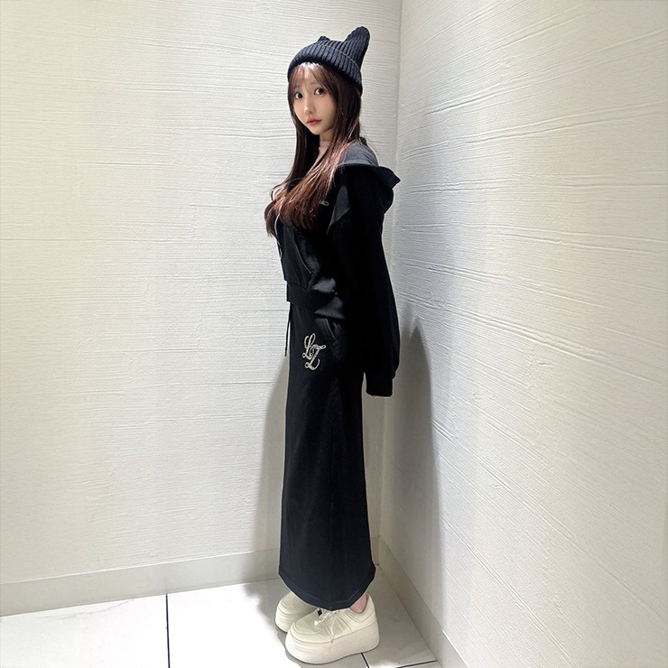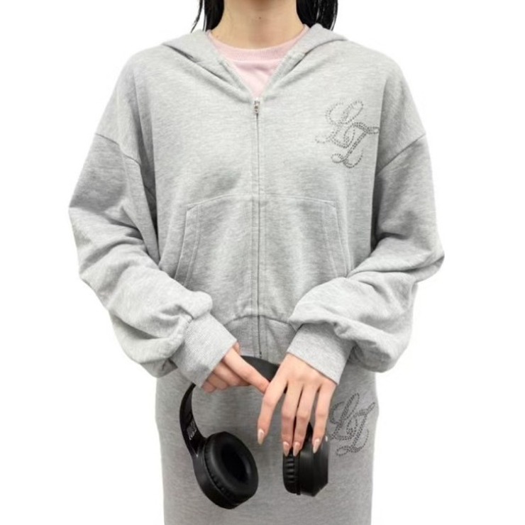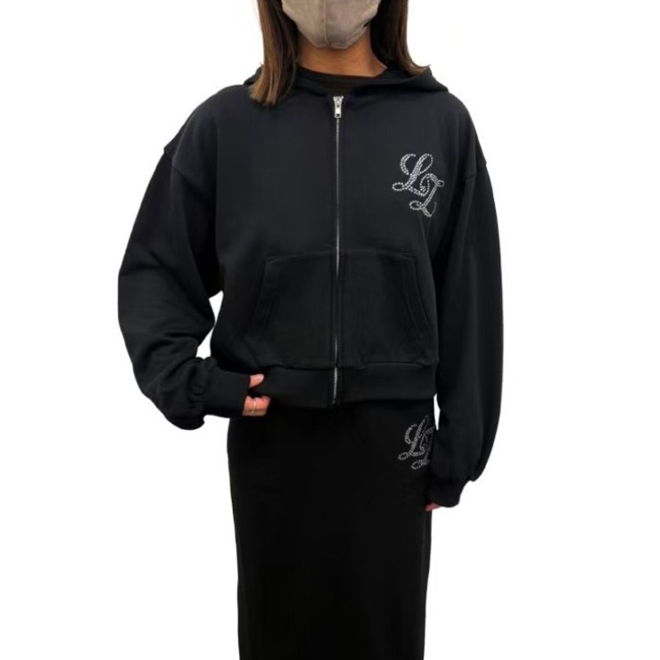 温度調節もジップパーカ―ならスマート。ラインストーンのロゴがさりげなくおしゃれ