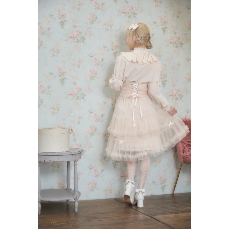 襟元にたっぷりとフリルをあしらった、クラシカルなデザインブラウス。