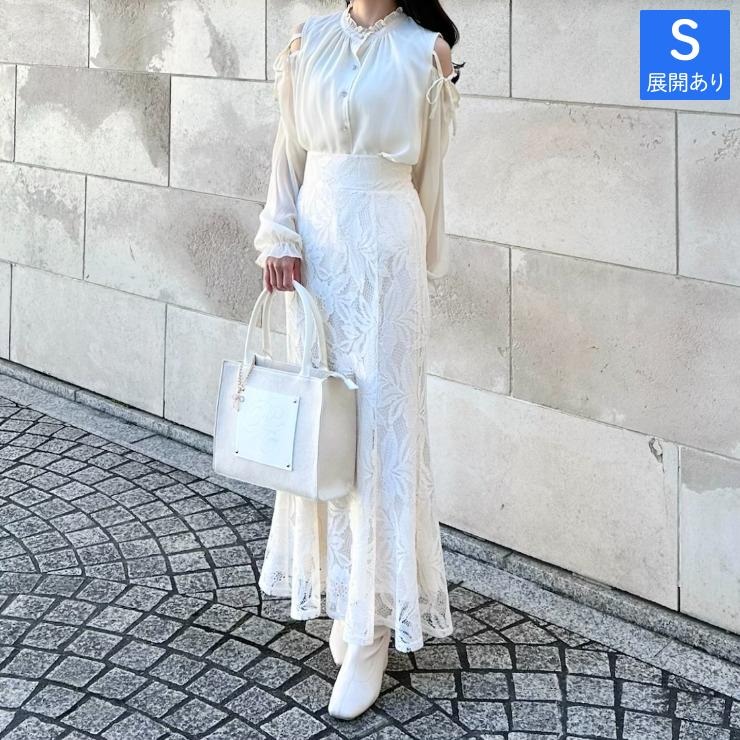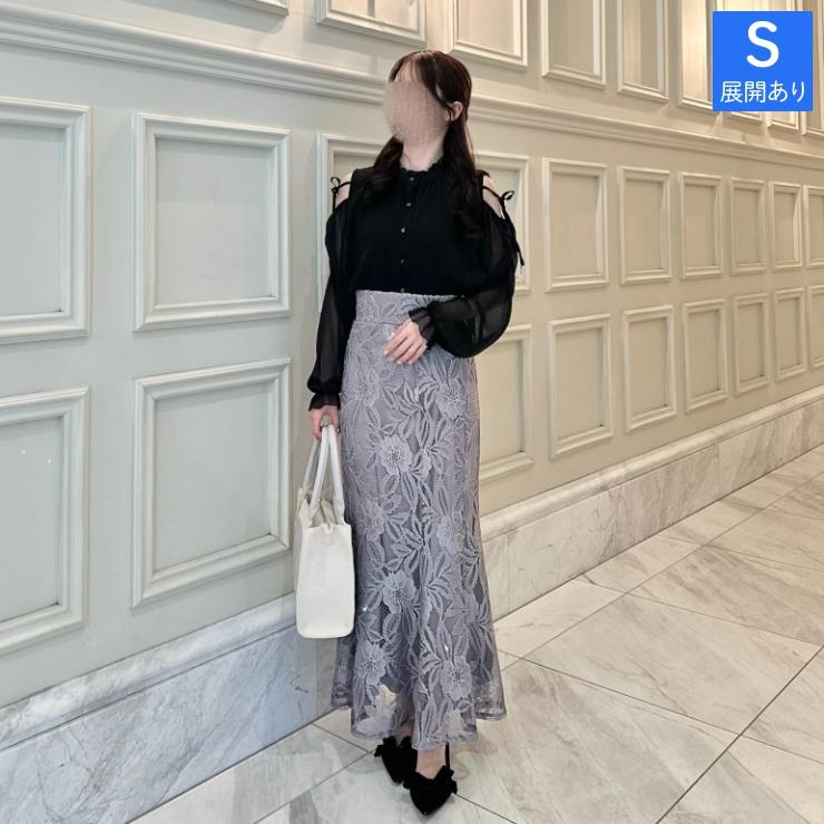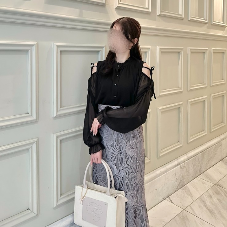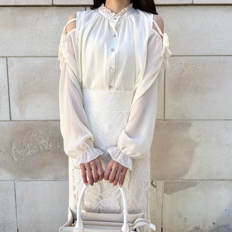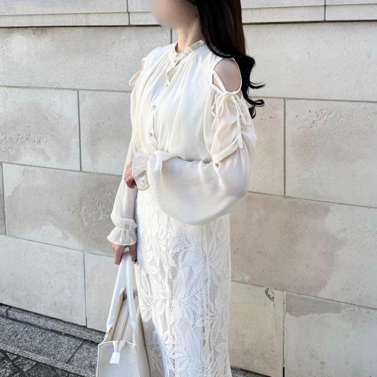 シアー素材の肩あきブラウスは上品フェミニンな着こなしができるアイテム。