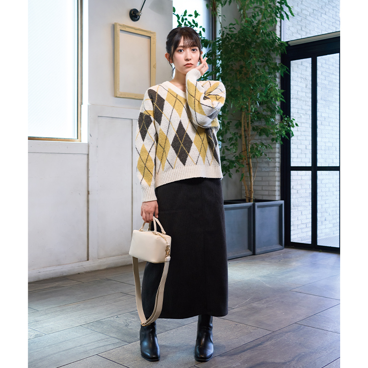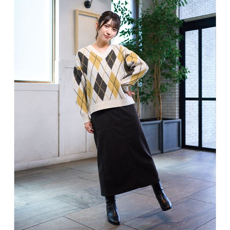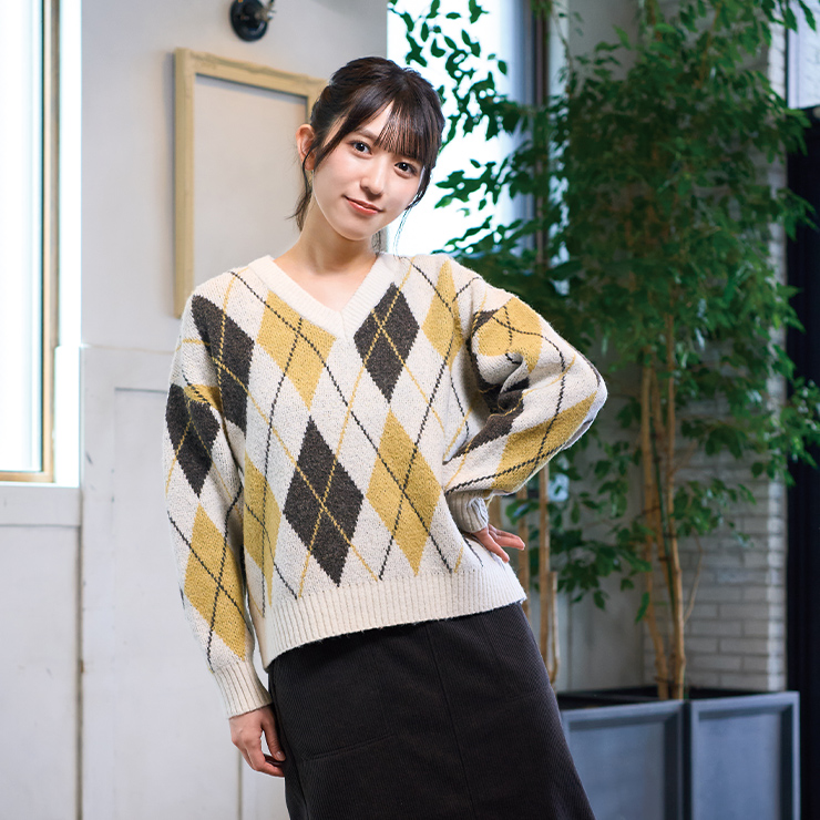 アーガイル柄のVネックのニットプルオーバーで生地がしっかり