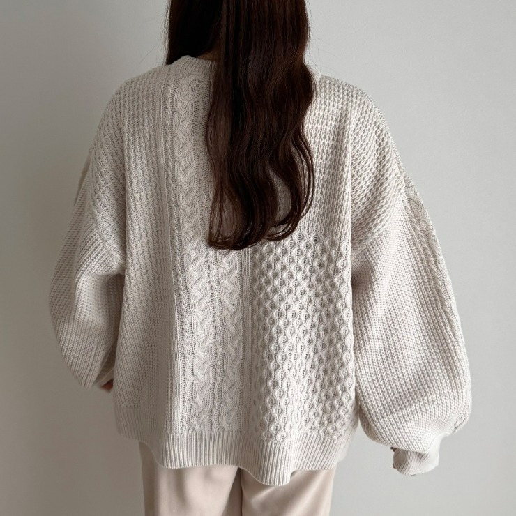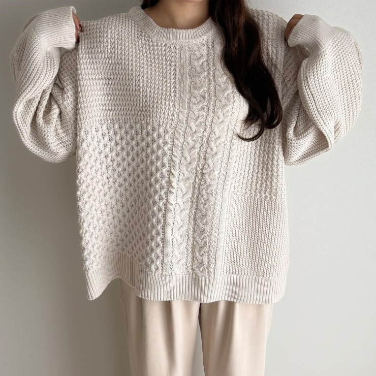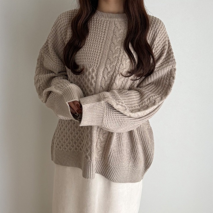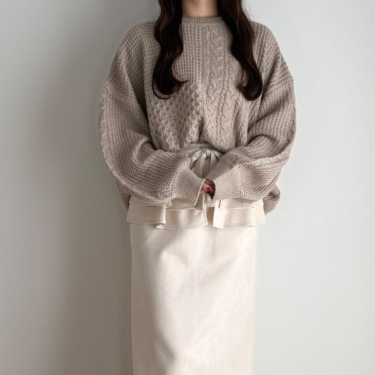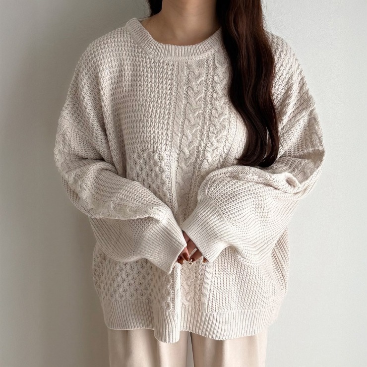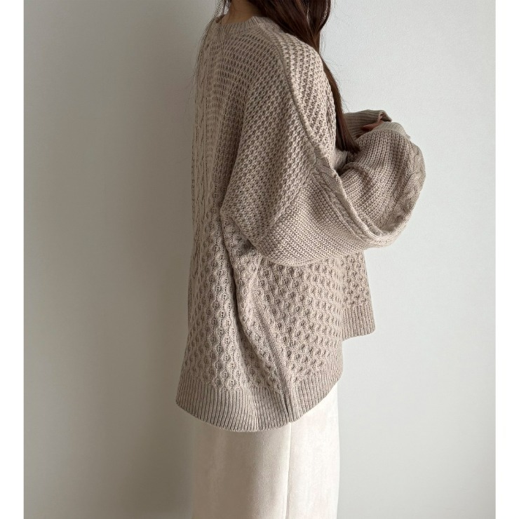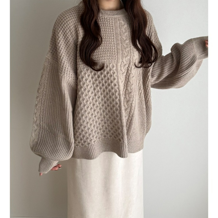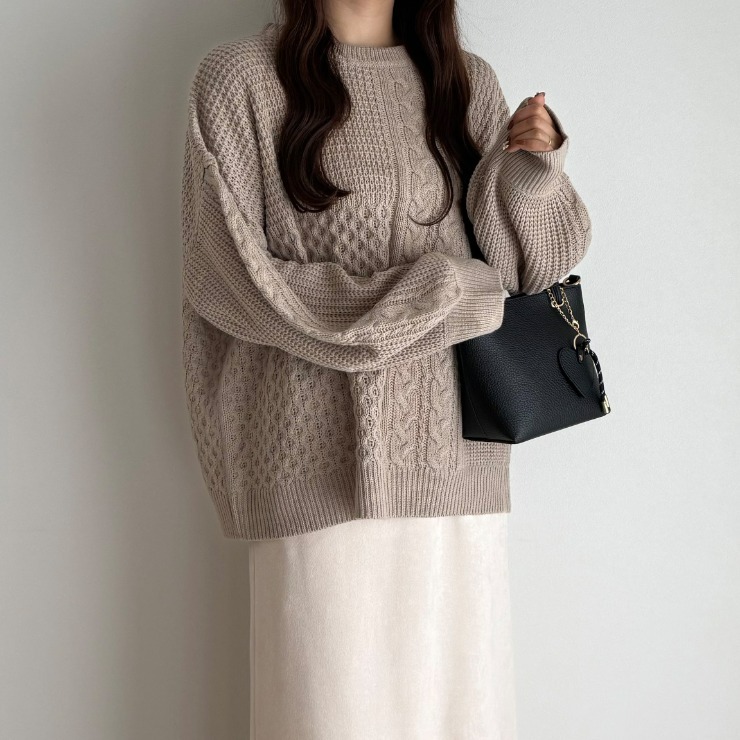 ケーブル編みや格子柄など、異なる編地の切り替えがアクセントとなり、1枚で存在感のあるスタイリングが完成します。