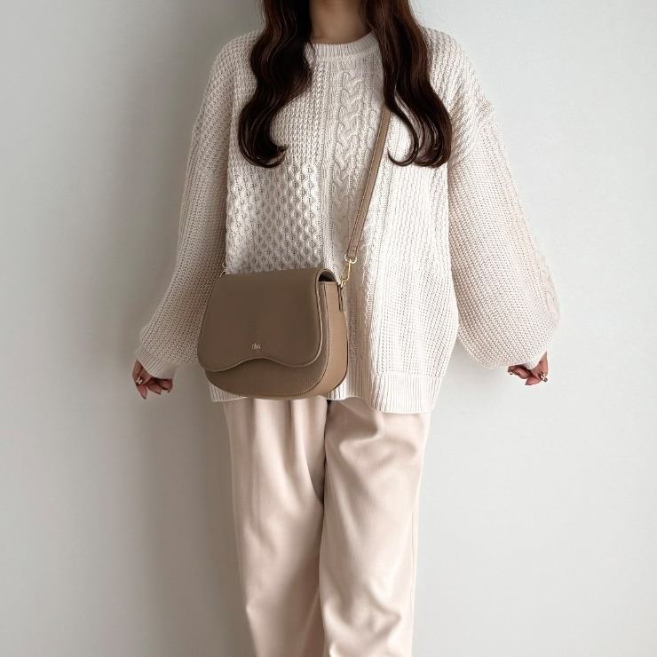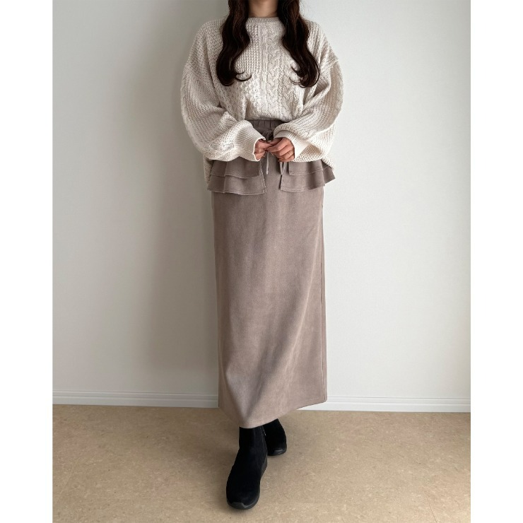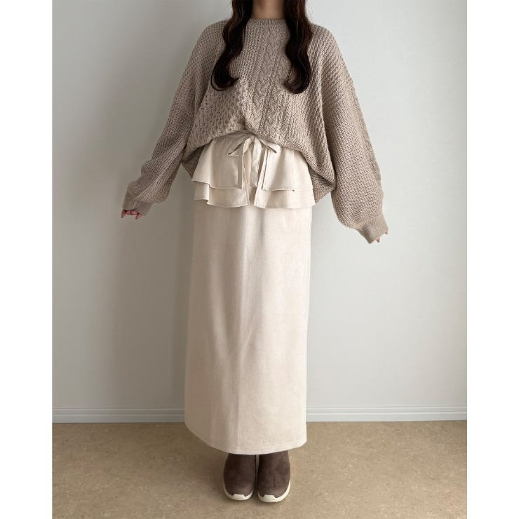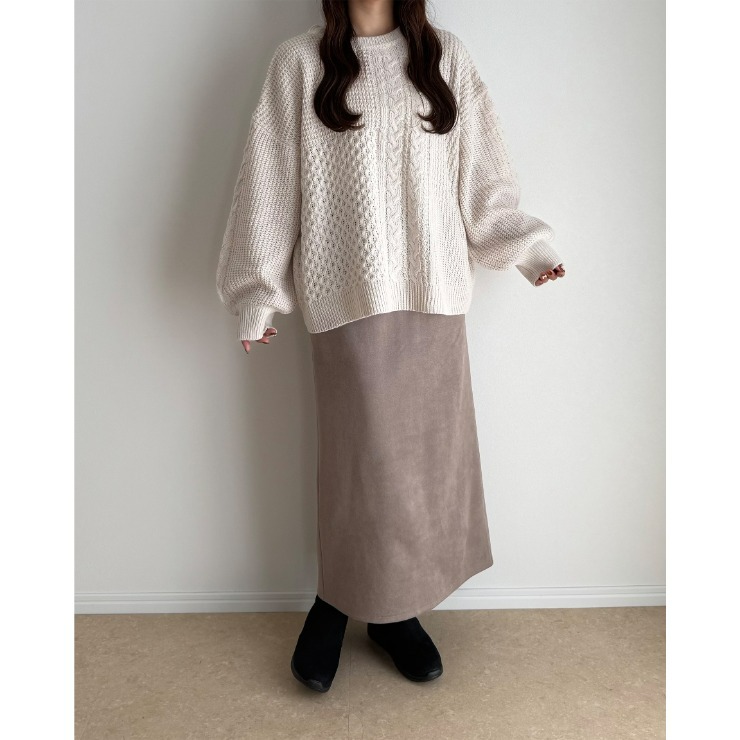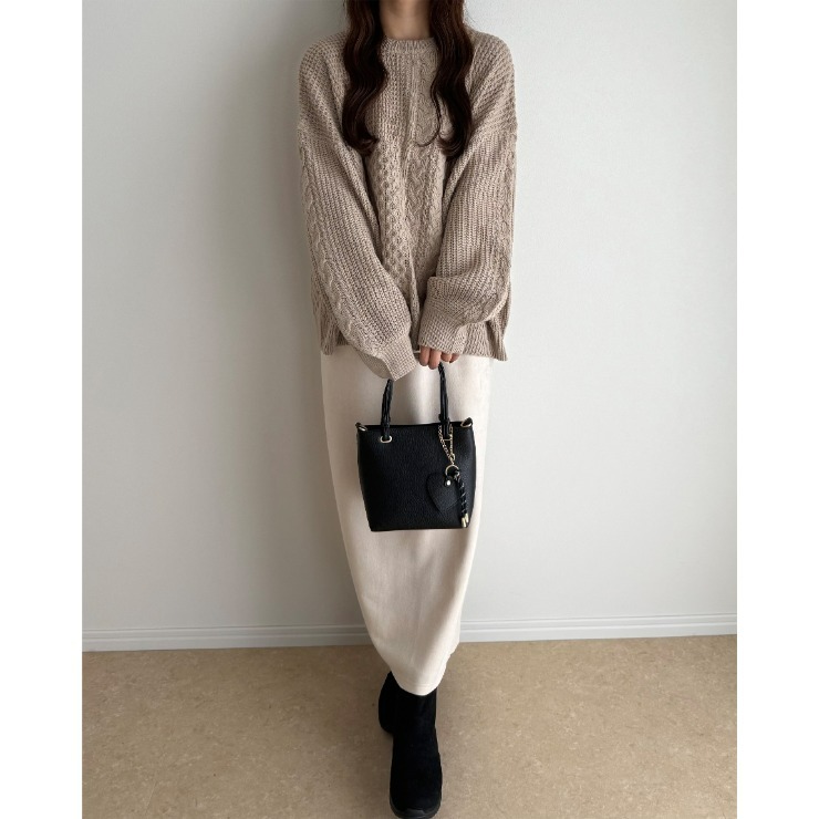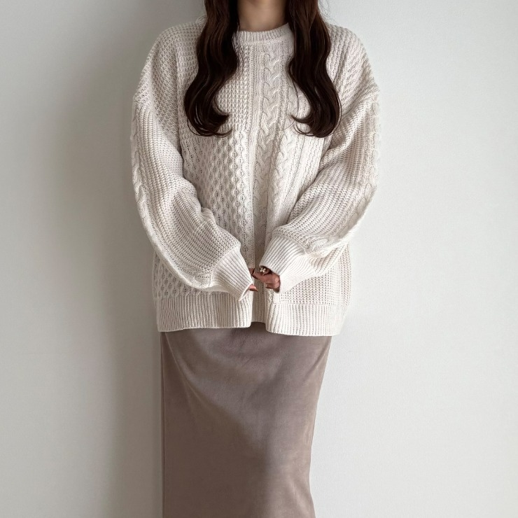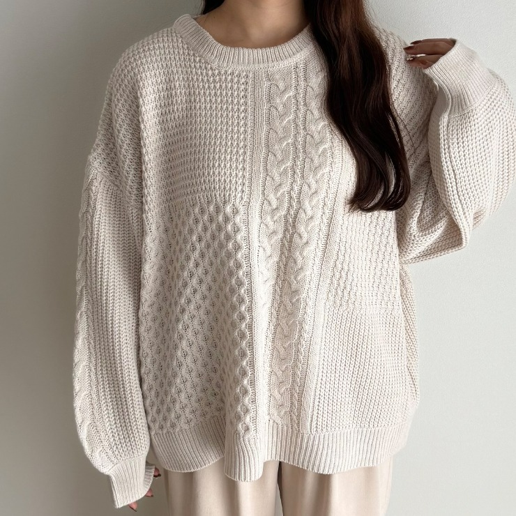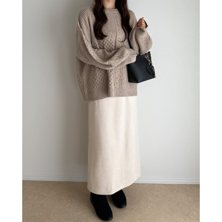 ケーブル編みや格子柄など、異なる編地の切り替えがアクセントとなり、1枚で存在感のあるスタイリングが完成します。