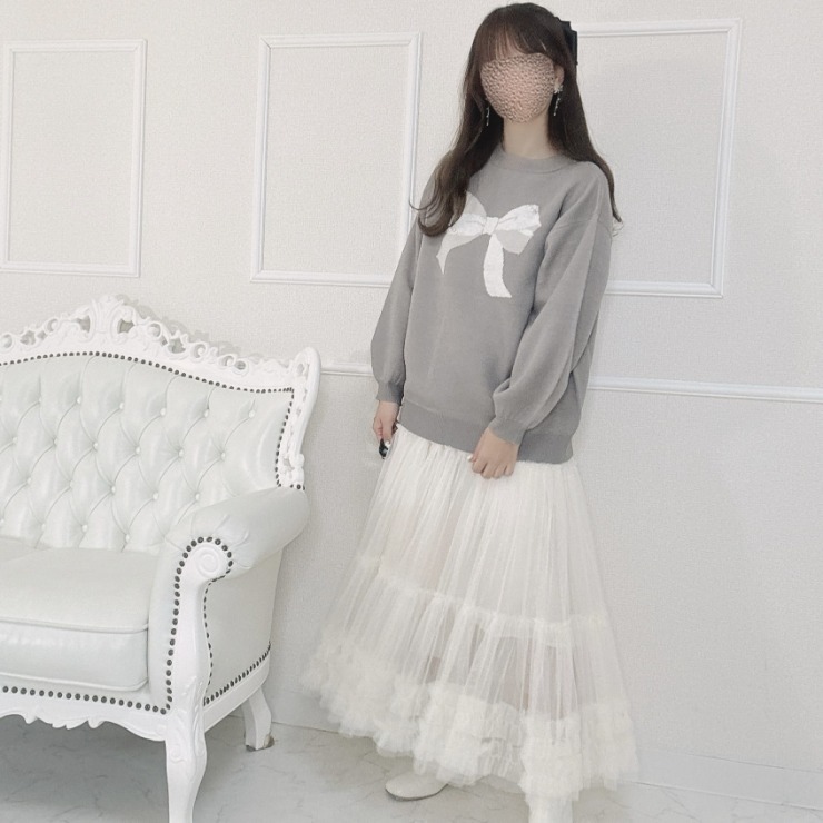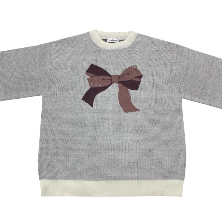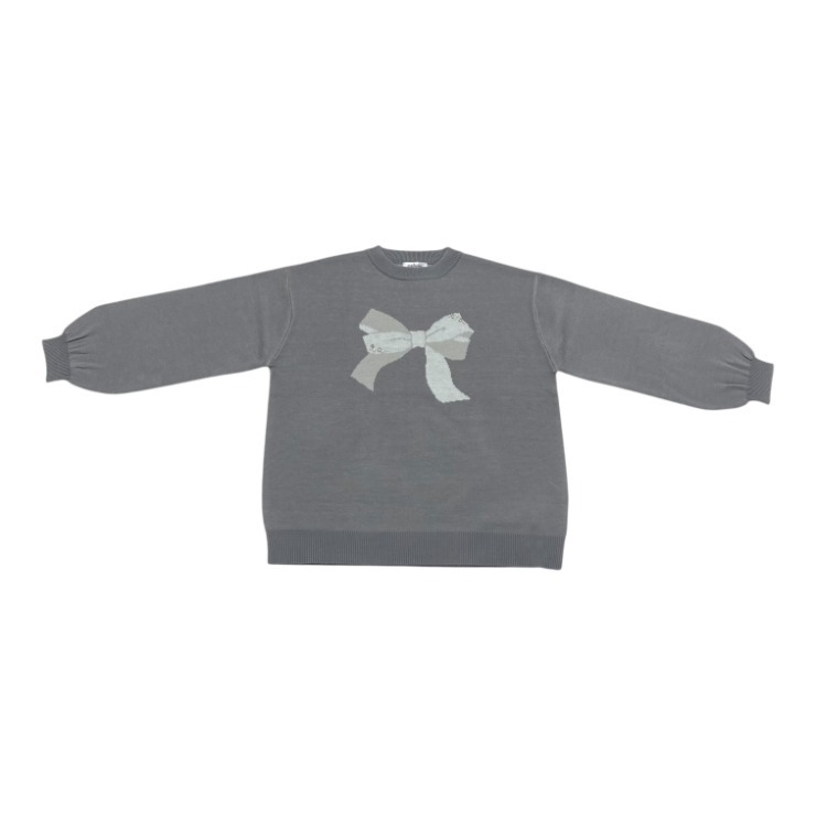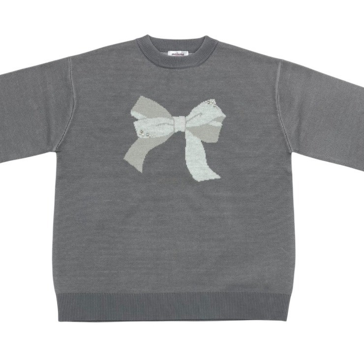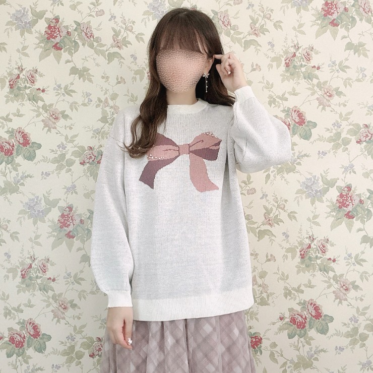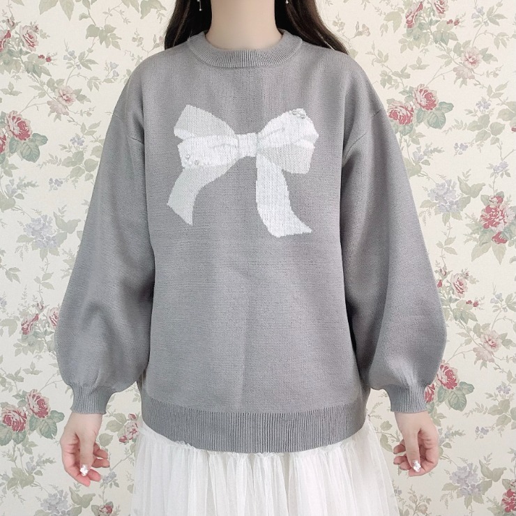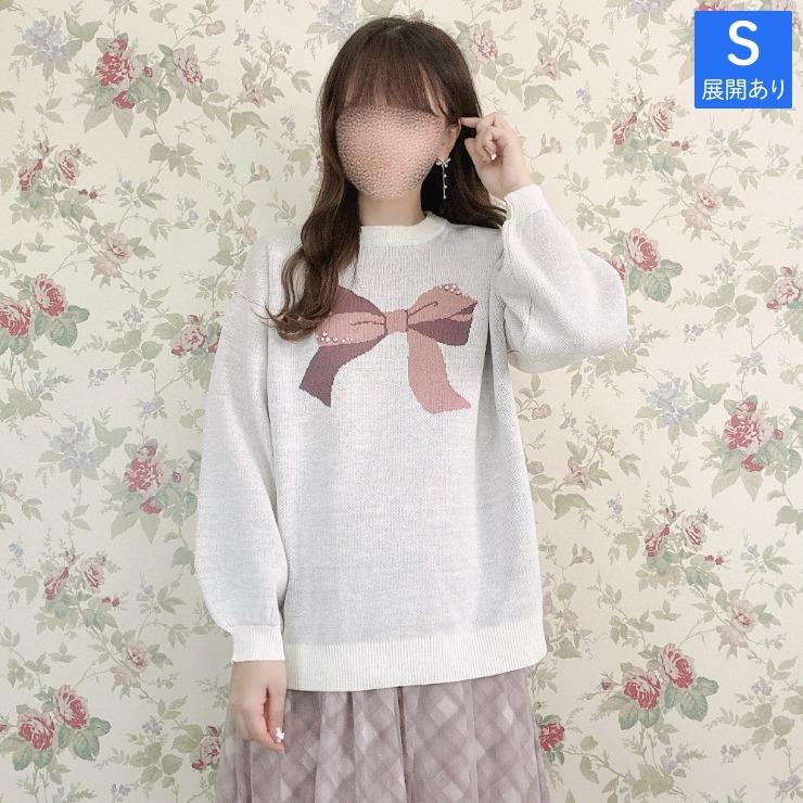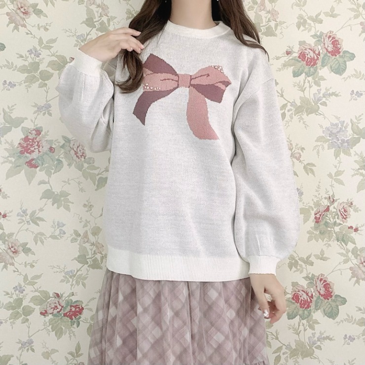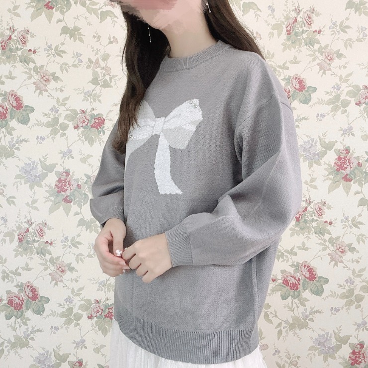 リボン2色使いのジャガード柄でパールとラインストーンがポイントのプルオーバーです。
