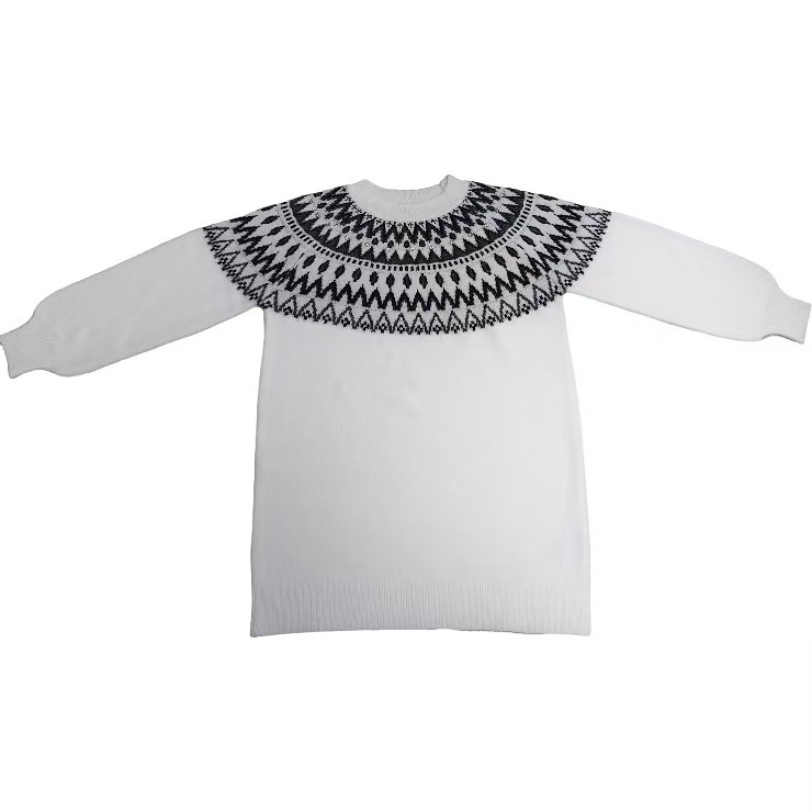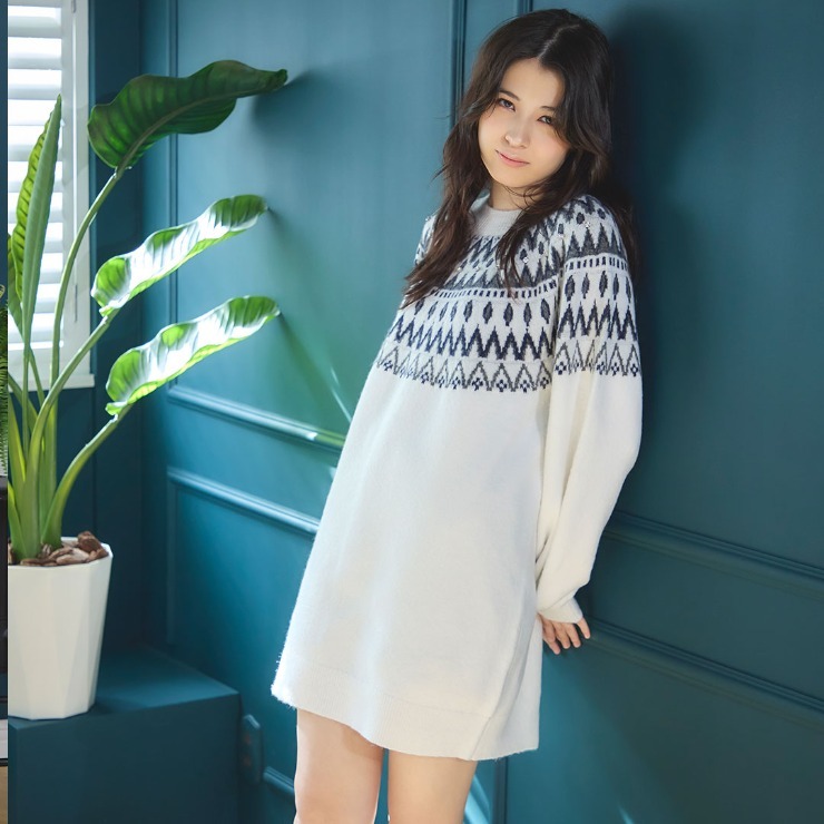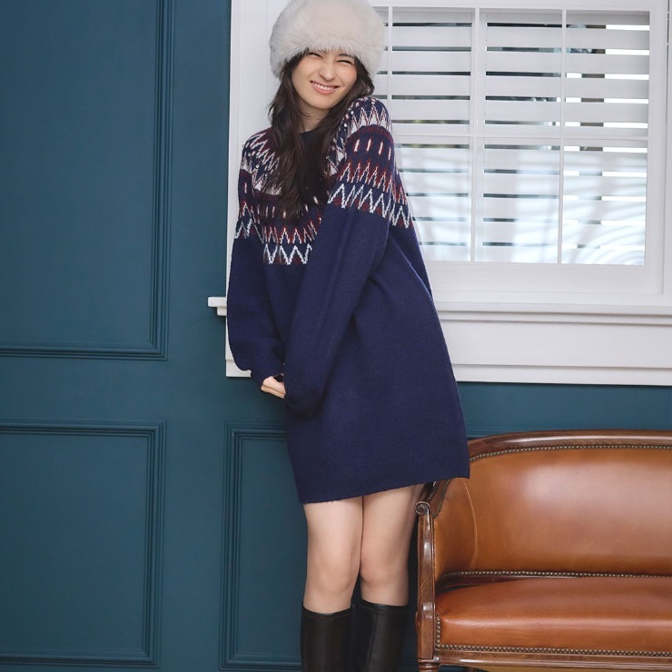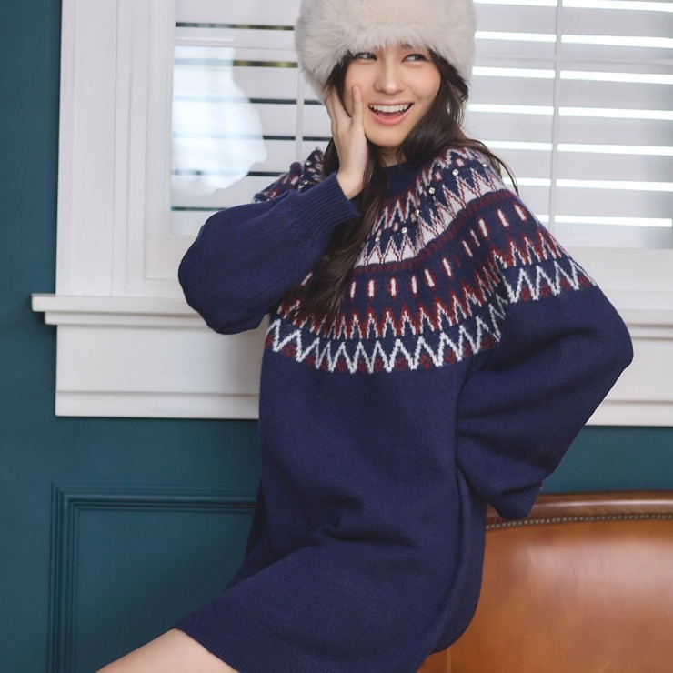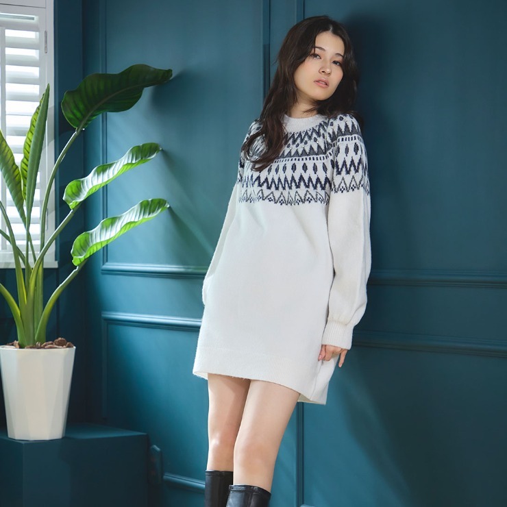 北欧ライクな求心柄が華やかで、1枚でコーデが完成するニットワンピ。