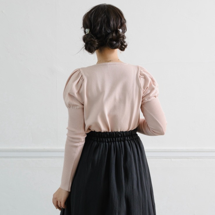 Vネックとパフスリーブが女性らしく、やわらかな天竺素材を使用しているため、
