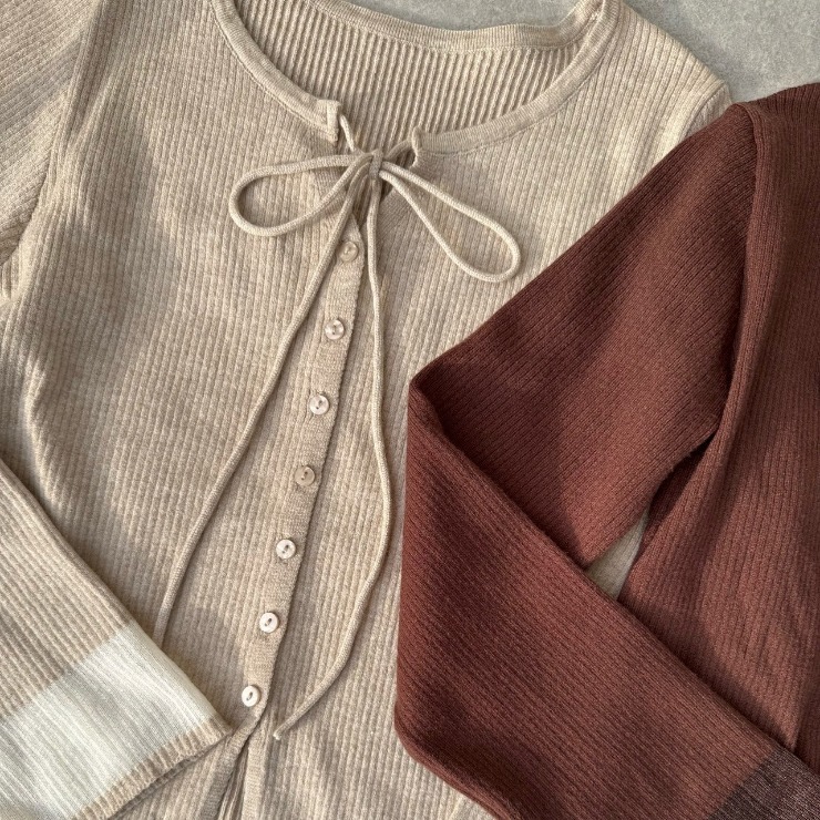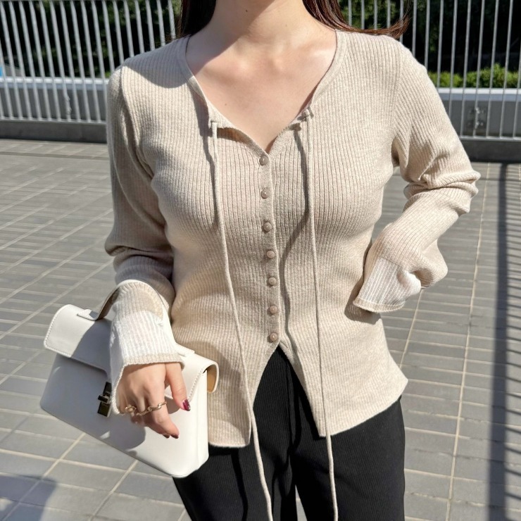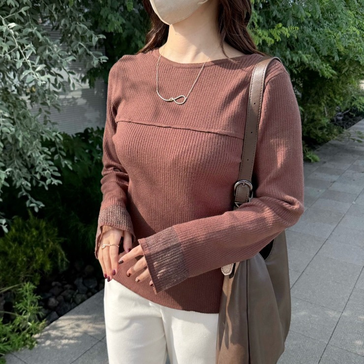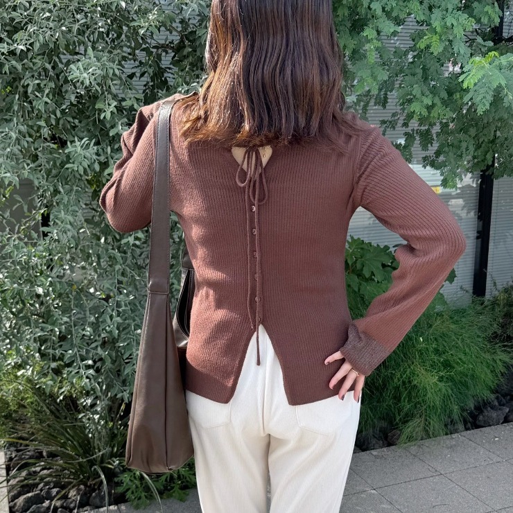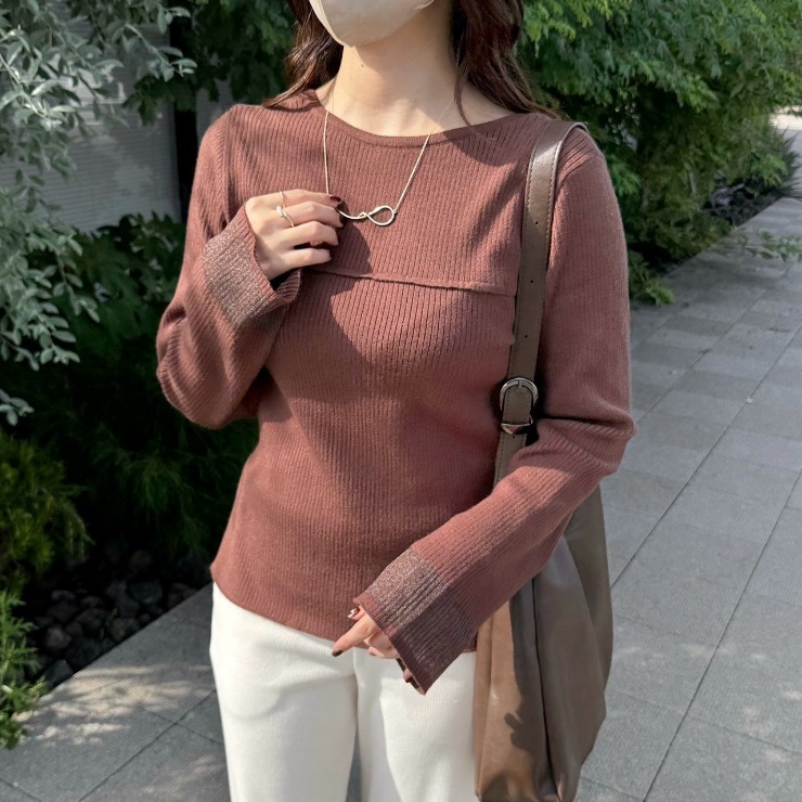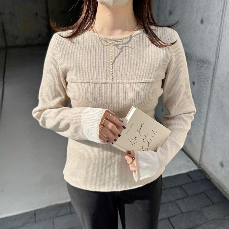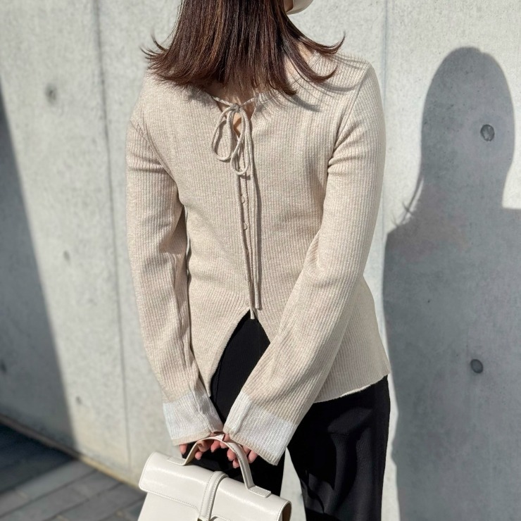 女性らしいデコルテラインを引き立てるネックデザインと、細リブの伸び感が身体にほどよくフィット。