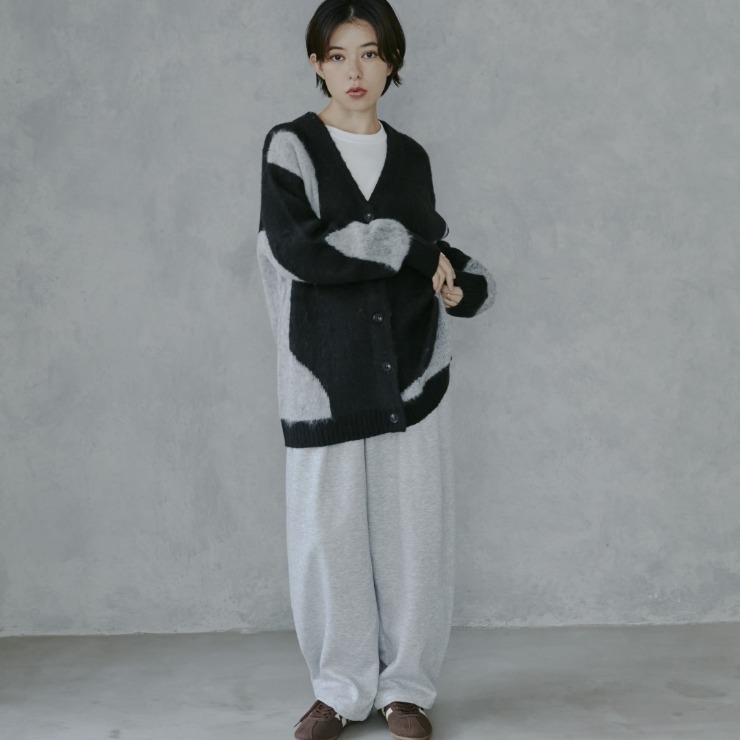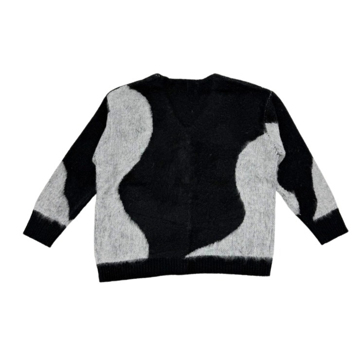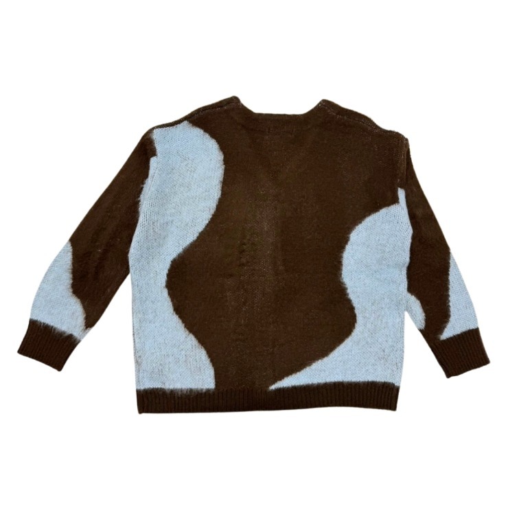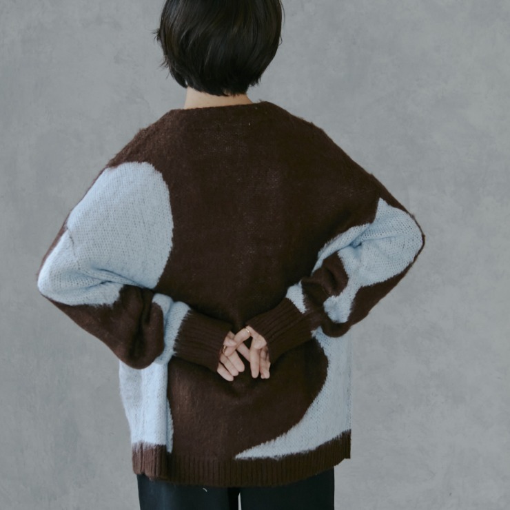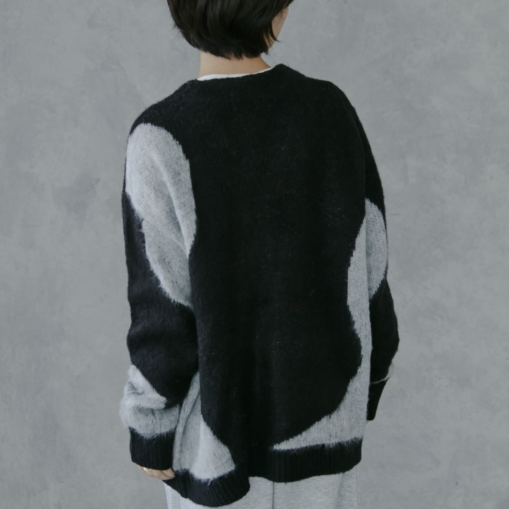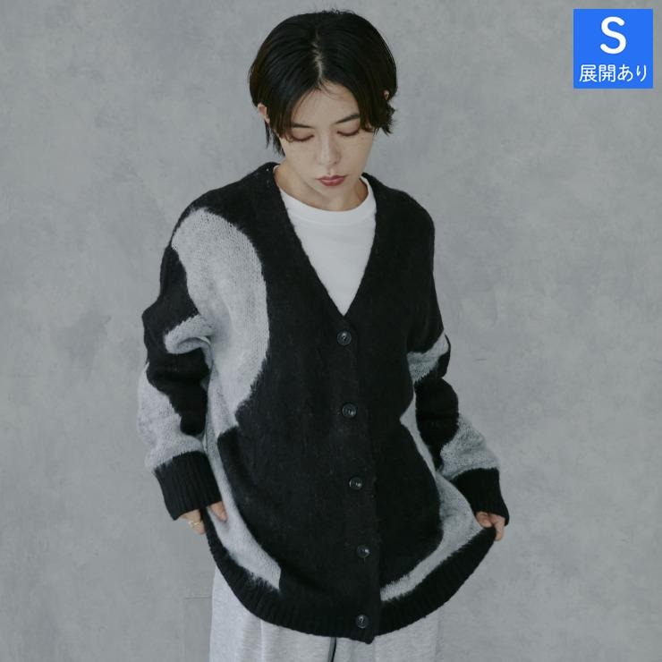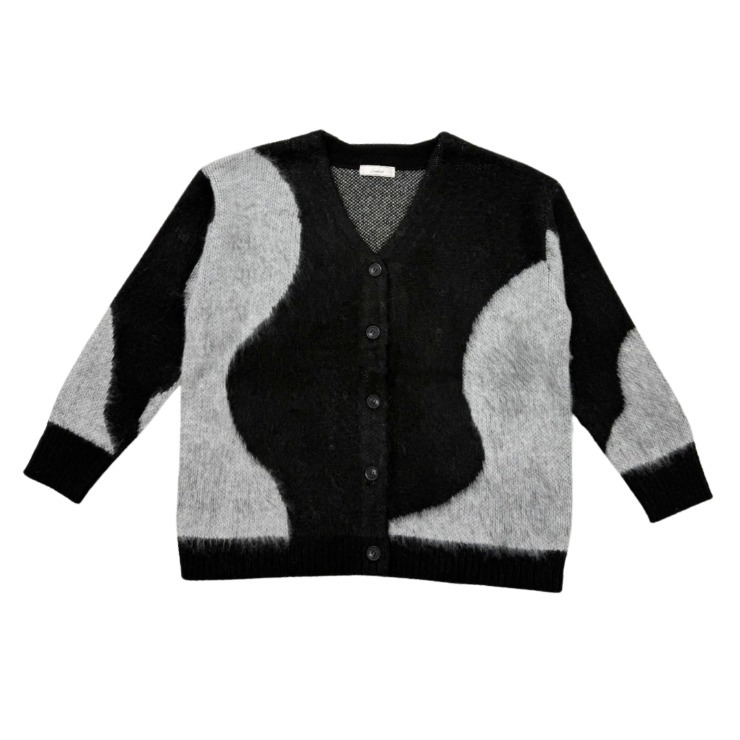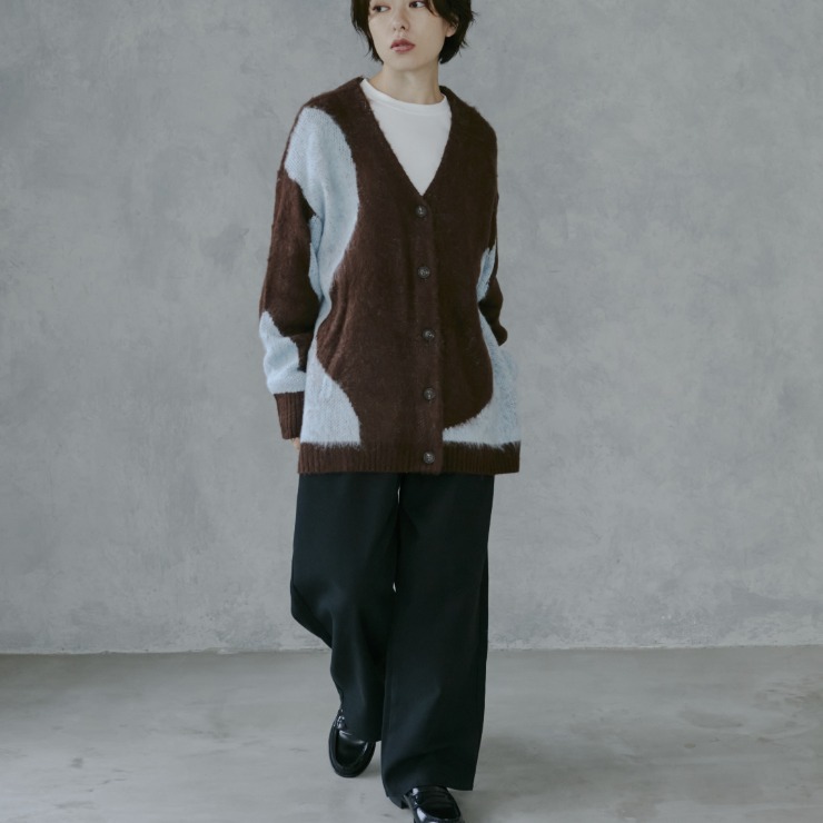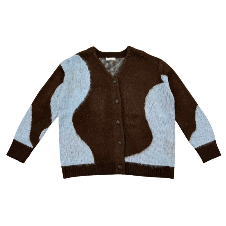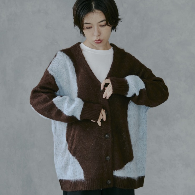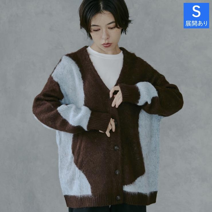 起毛加工でふんわりとした生地のニュアンス柄ニットカーディガン。