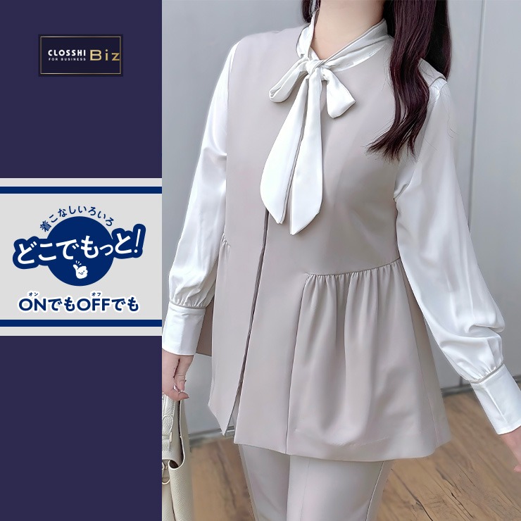 ボウタイブラウスなどデザインブラウスと合わせることでトレンド感があるスタイリングになります。