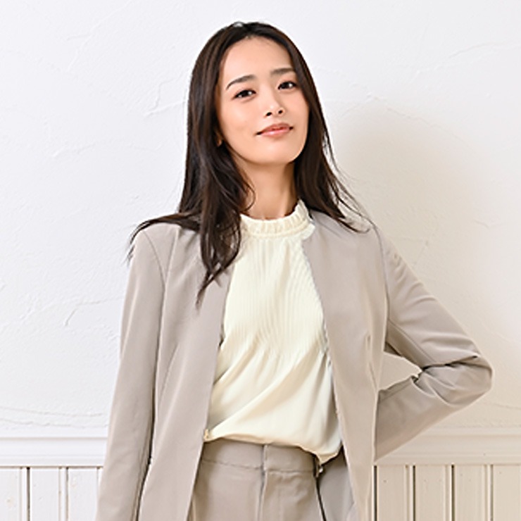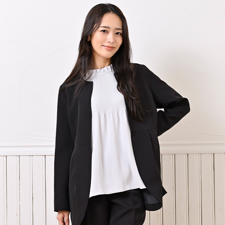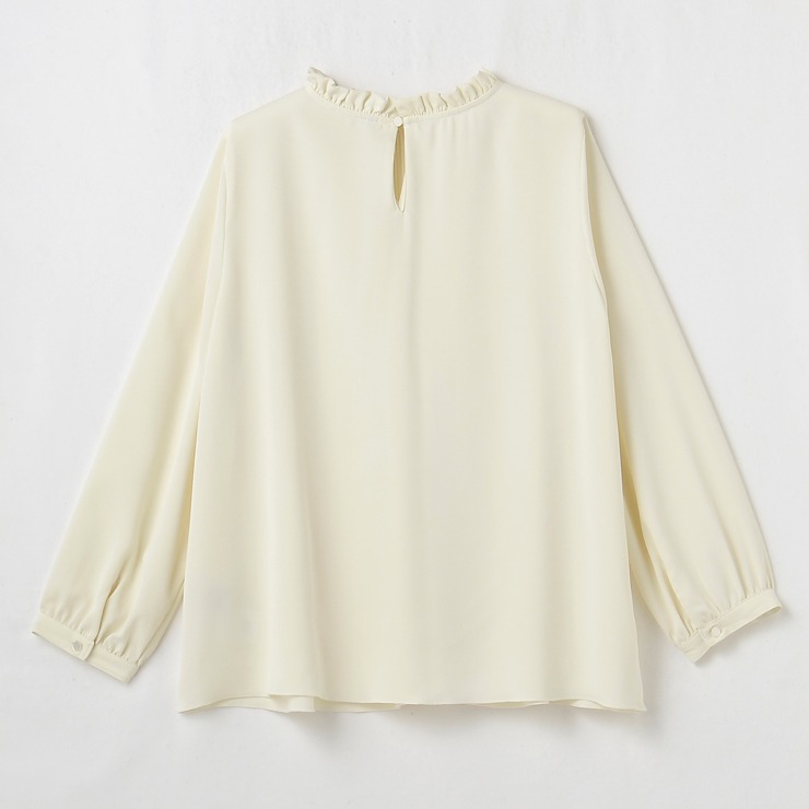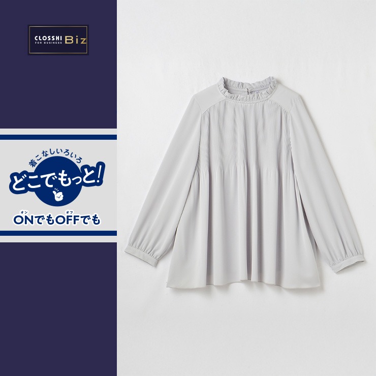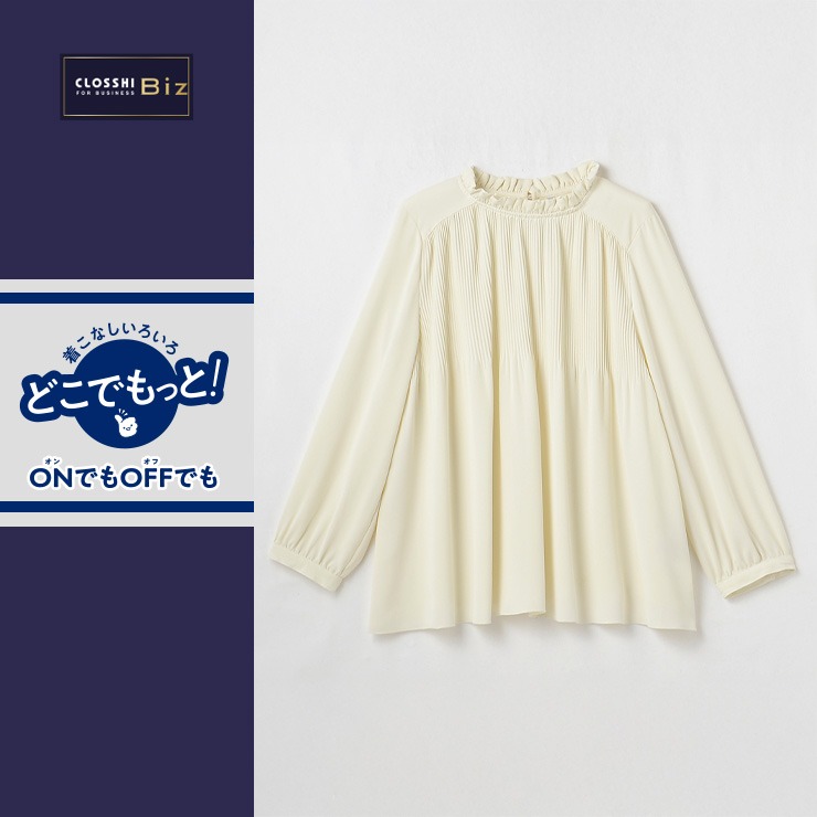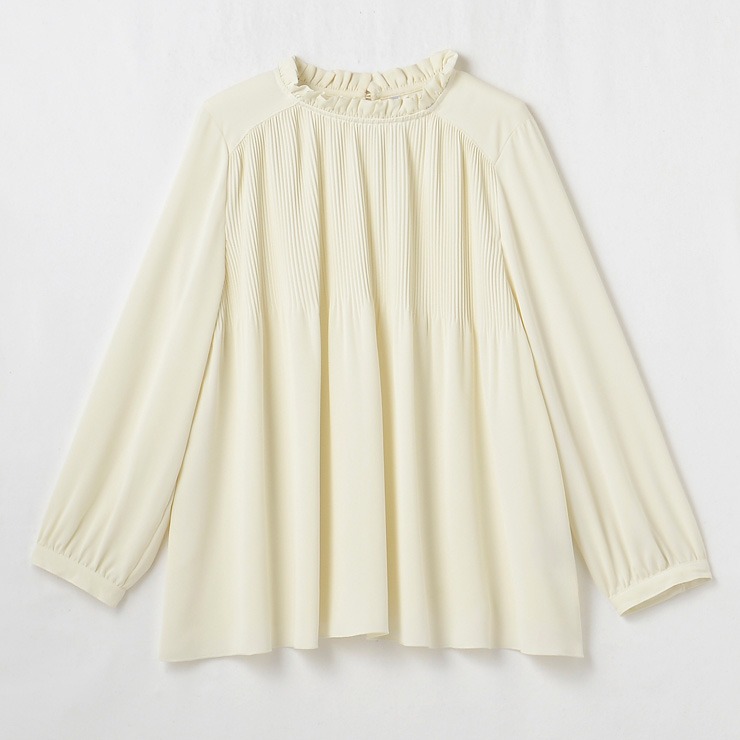 顔まわり華やかなフリル衿に表情豊かな細かいプリーツデザインで華やかな印象のブラウスです。