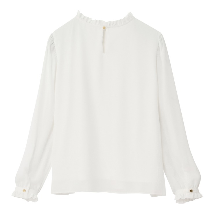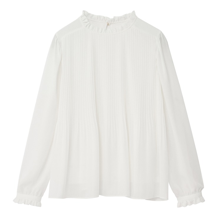 軽やかに揺れるシフォンジョーゼットを使用した、胸元プリーツが上品な印象のブラウスです。
