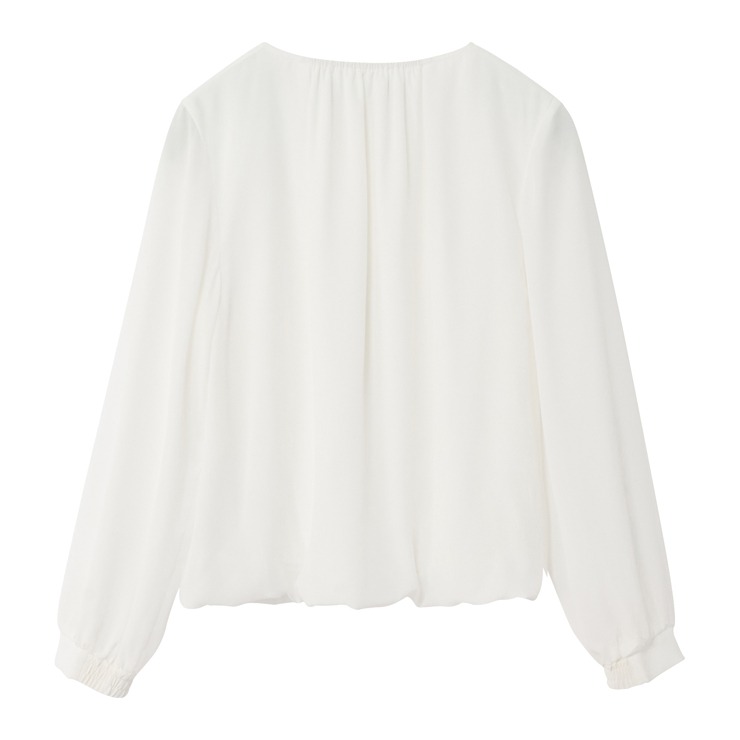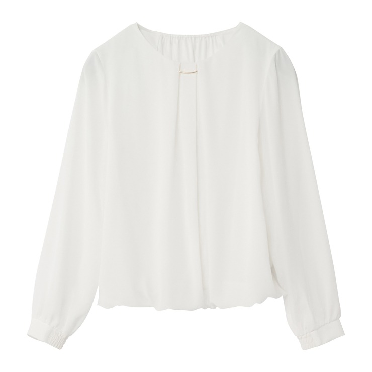 軽やかなシフォンジョーゼットに裾バルーンを組み合わせた、女性らしく華やぐブラウスです。