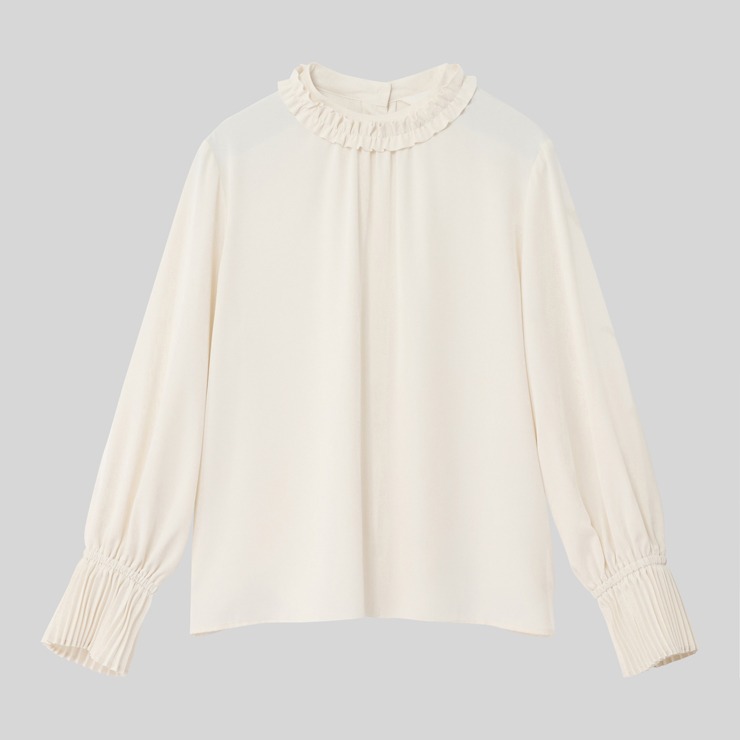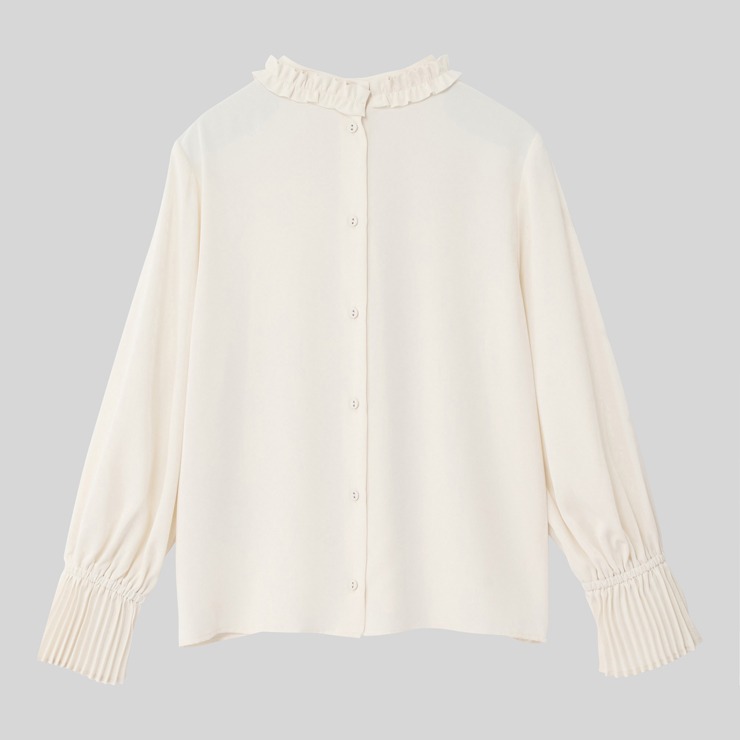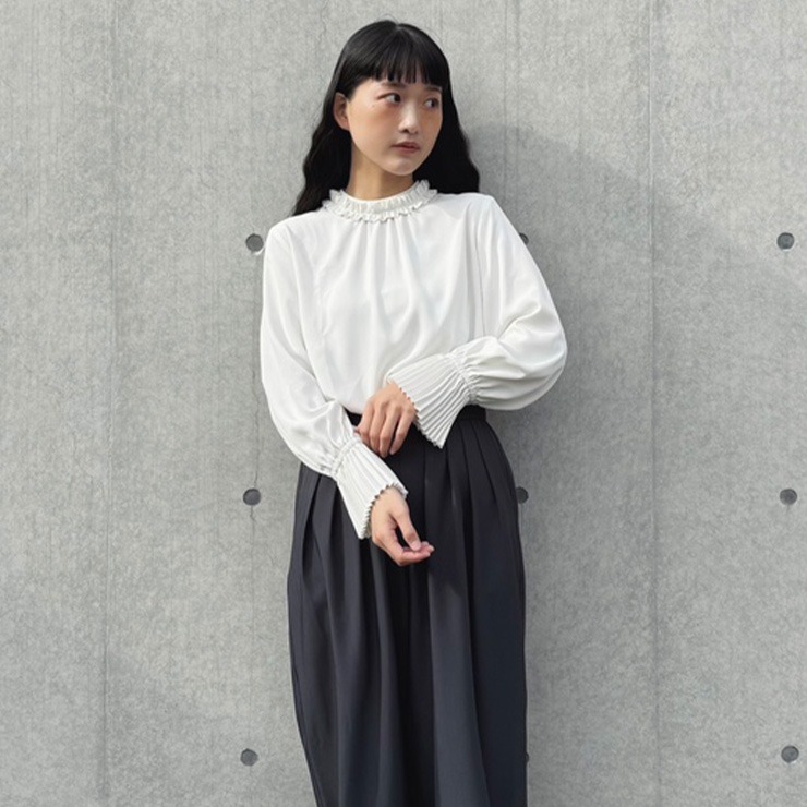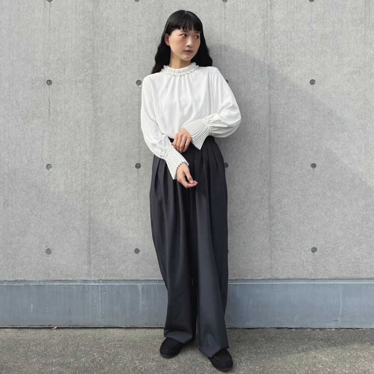 襟のフリルと袖のプリーツがポイントの可愛いブラウスです。