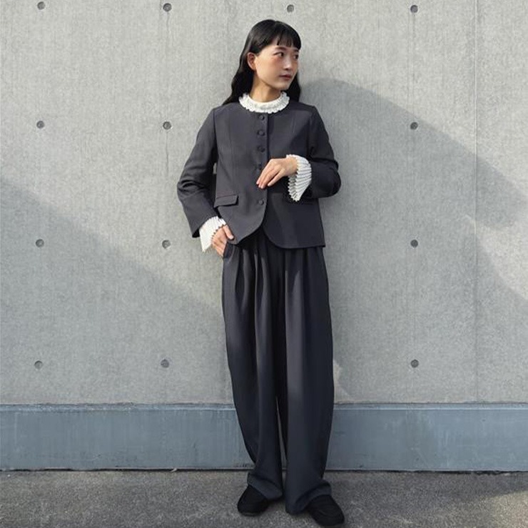 少し長めの袖丈でジャケットからプリーツ袖を出して着用して、トレンドのレイヤードコーディネートができます。