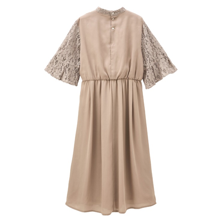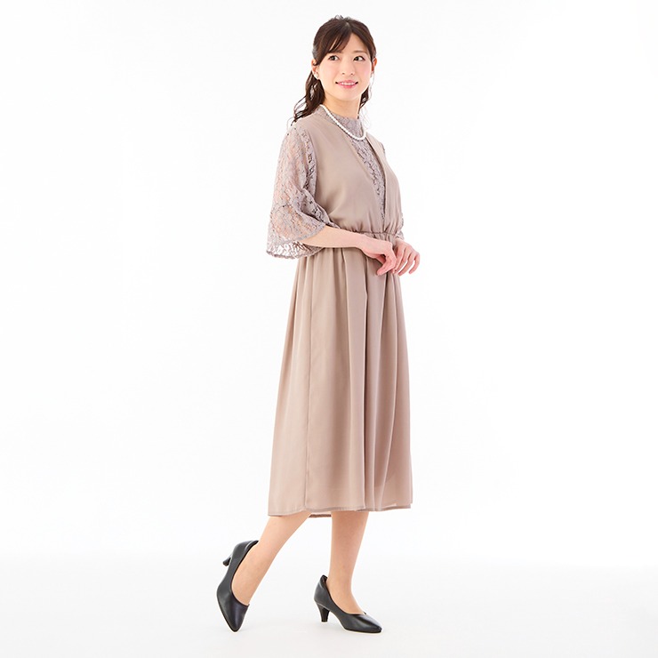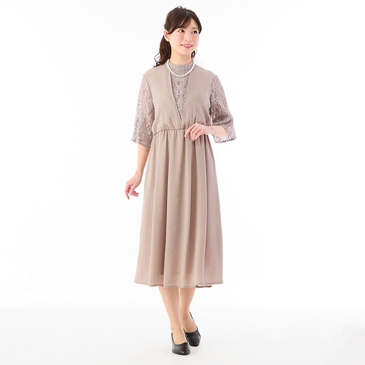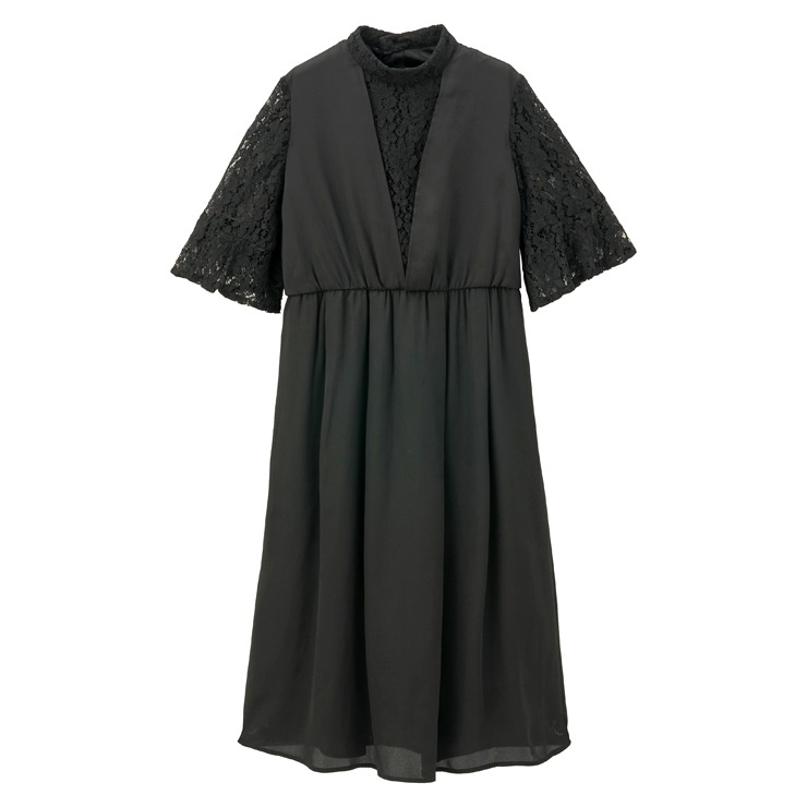 レースブラウスをレイヤードしたようなワンピースです。スタンドネックきちんと見えし、今らしいデザインとなっております。ウエストゴムで着心地が良い仕様となっております。