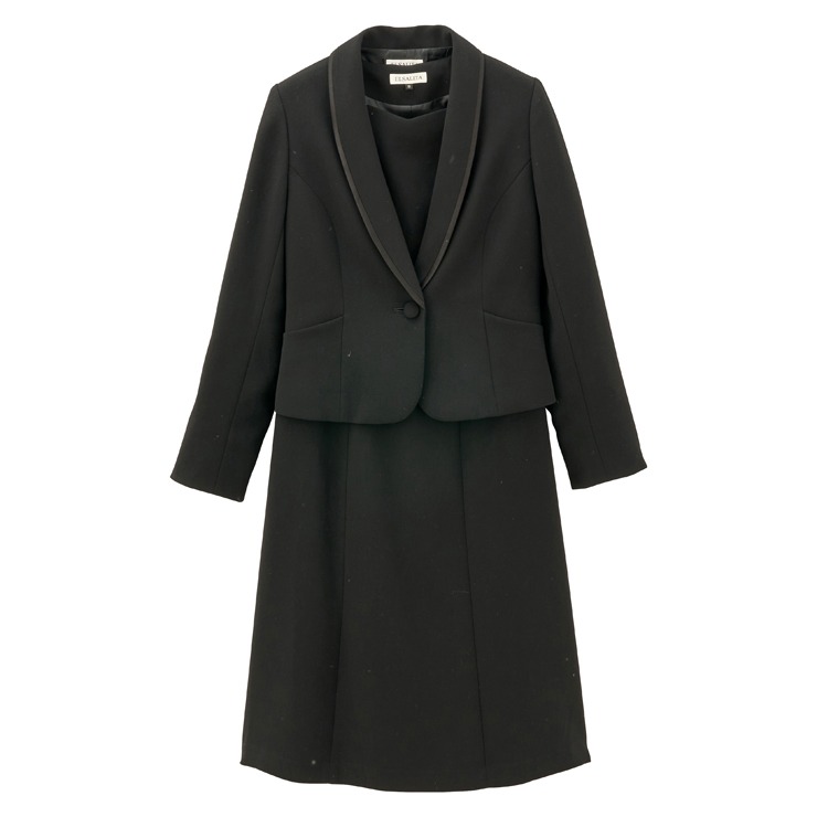 サテン切り替えのショールカラージャケットと、前開きワンピースのセットです。