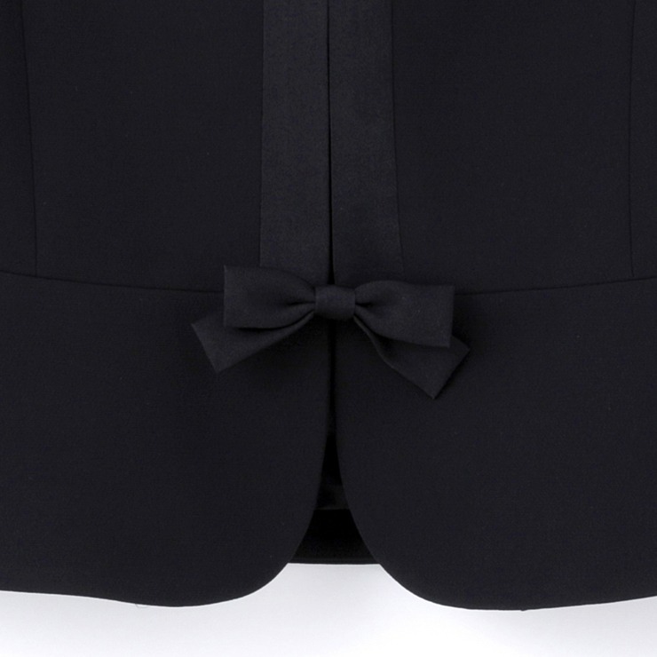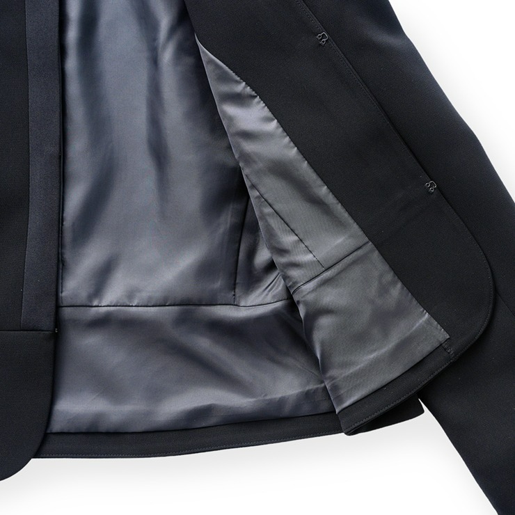 ジャケットの中心に縦のサテン切り替えデザインを入れる事により、視点が中心に向かい、縦長効果を生みます。
