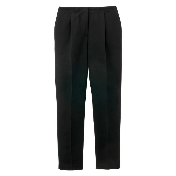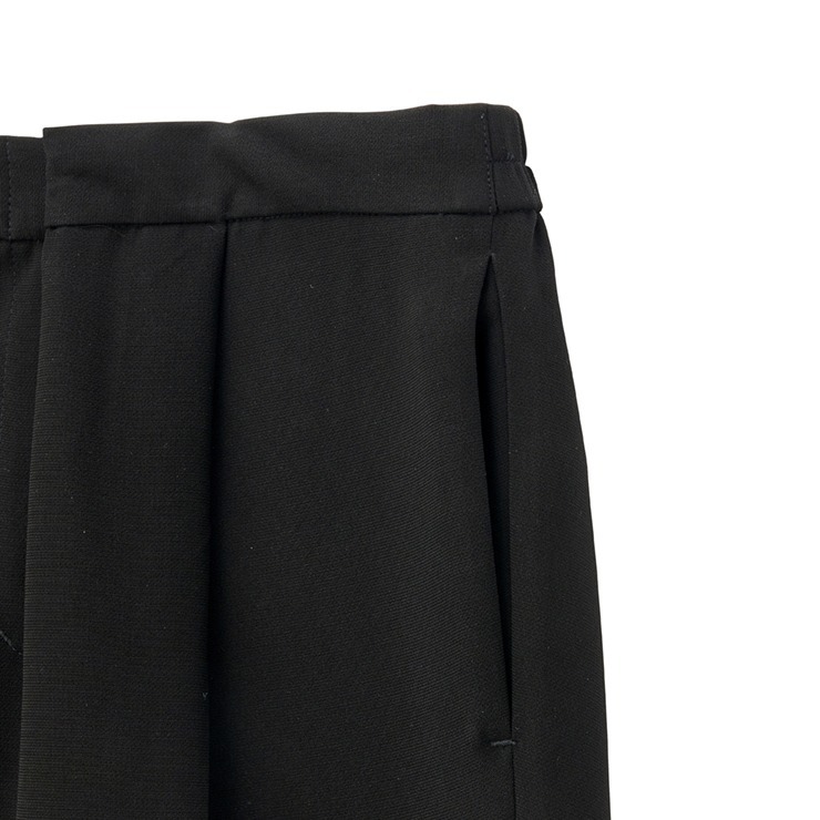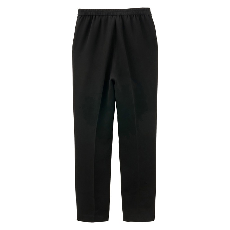 ブラックフォーマル染している為、深みのある黒で上品な印象を与えるアイテムです。後ろにゴム、前にタックが入っており腰回りにゆとりを持たせることで、スッキリしたシルエットとなっています。着心地にもこだわったテーパードデザインで誰でも楽に着こなすことが出来ます。