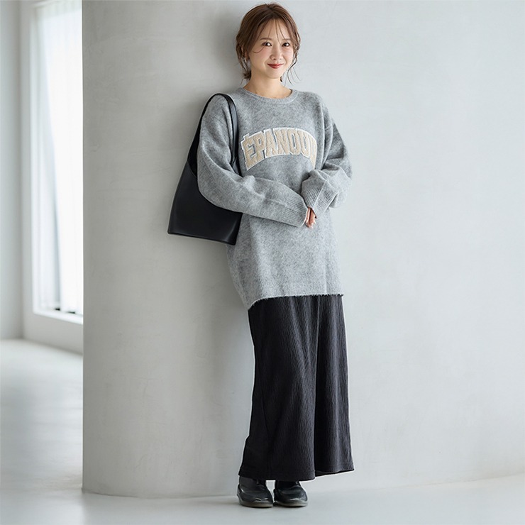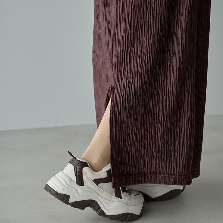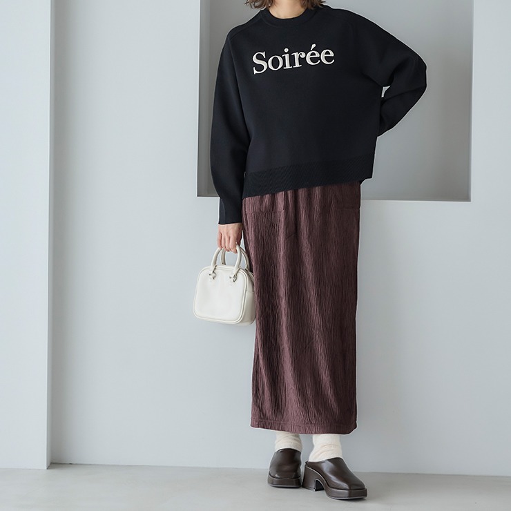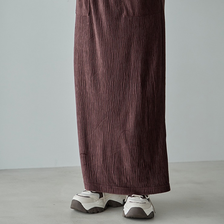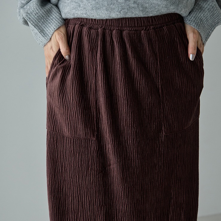 ベロア素材に楊柳加工を施したナロースカートです。ベイカーポケットがデザインのポイントに。ウエストはゴムで着脱がラク。内側に調整できる紐付き。後ろ中心にスリットがあり、足さばきがラク。