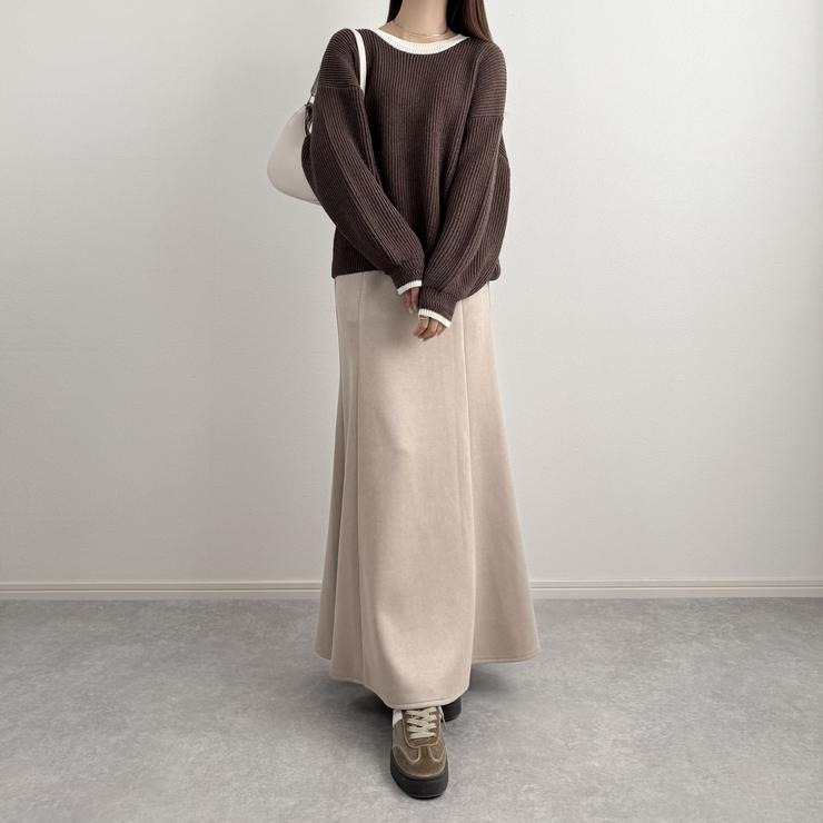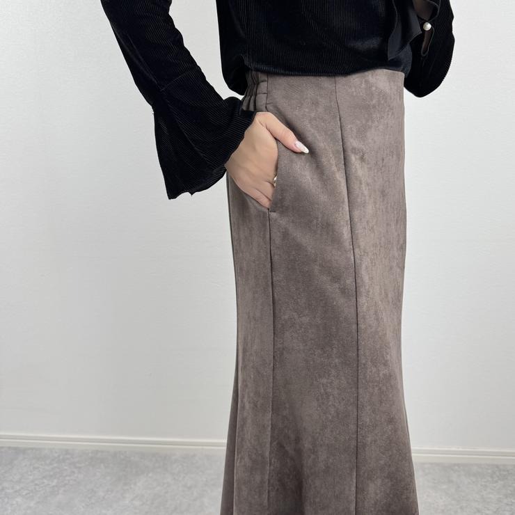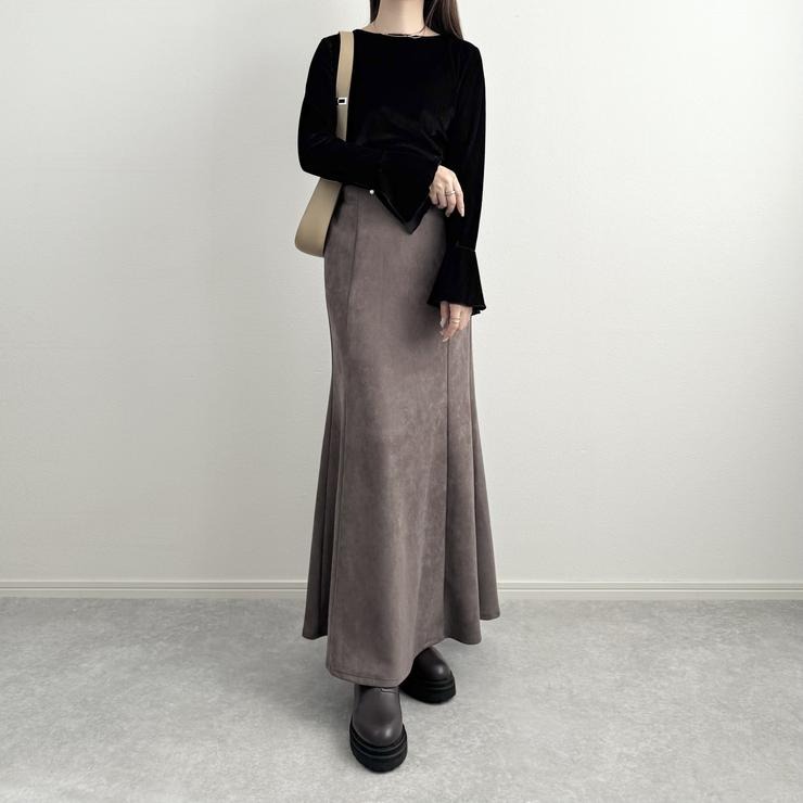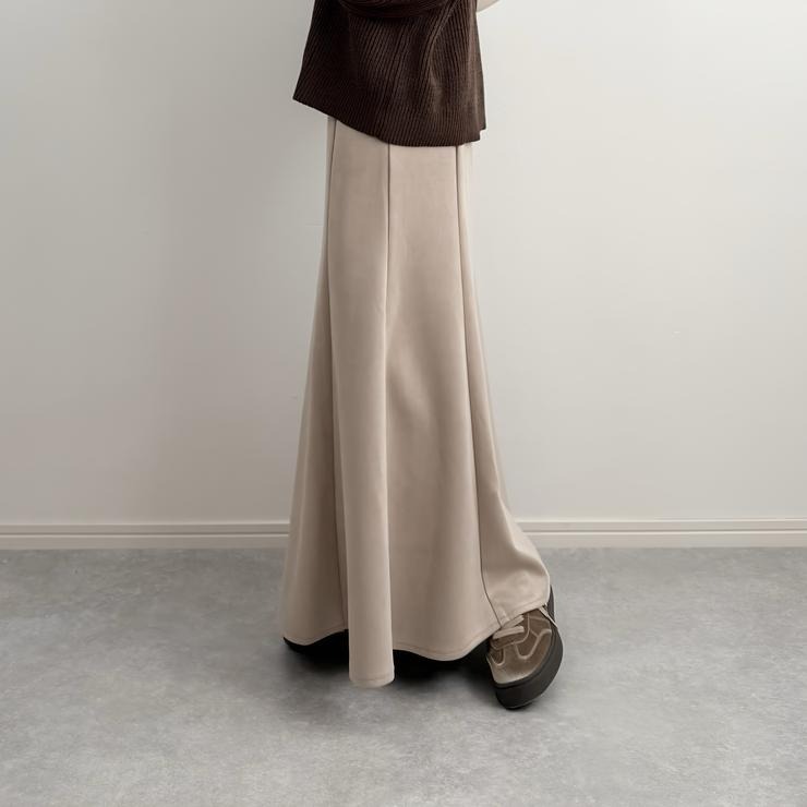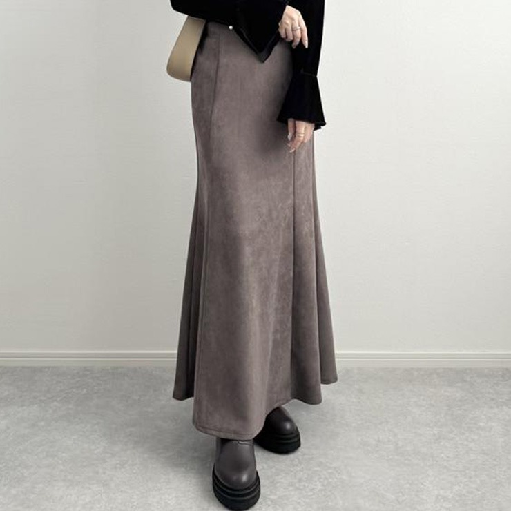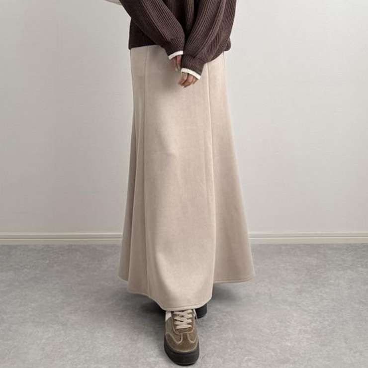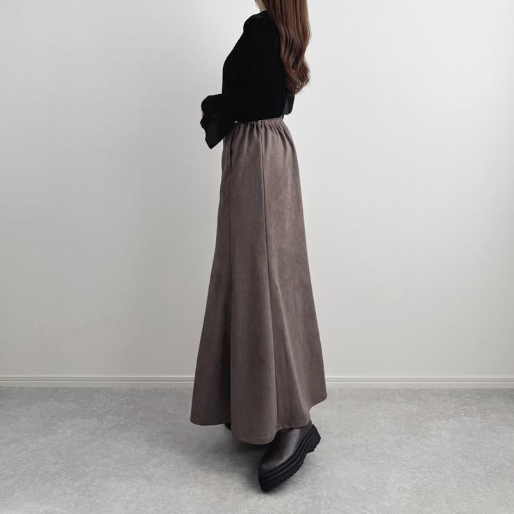 微起毛素材で秋のムードを引き立てるフレアマーメイドスカート。肌触り・肌馴染みが良く、ストレッチのある素材なので穿き心地がラク。ウエストは後ろゴムなので着脱もラクです。左右ポケット付き。