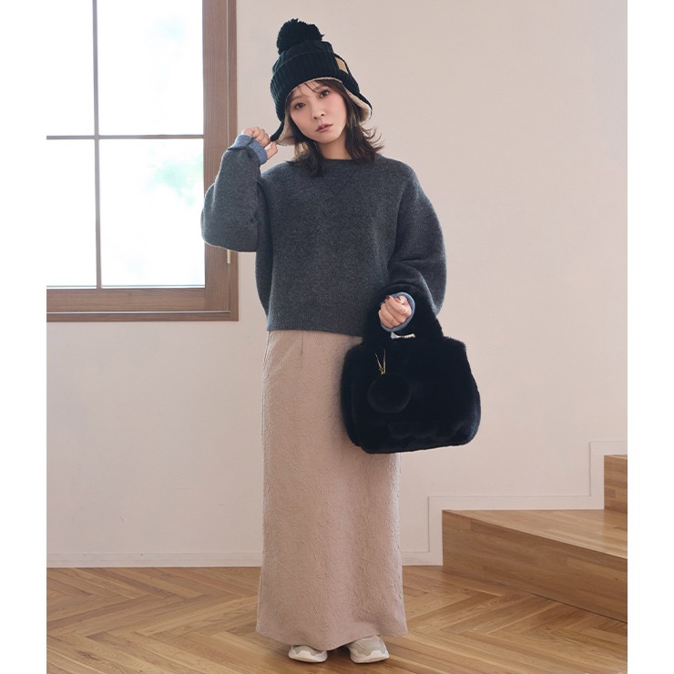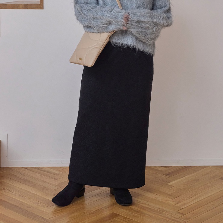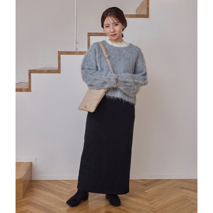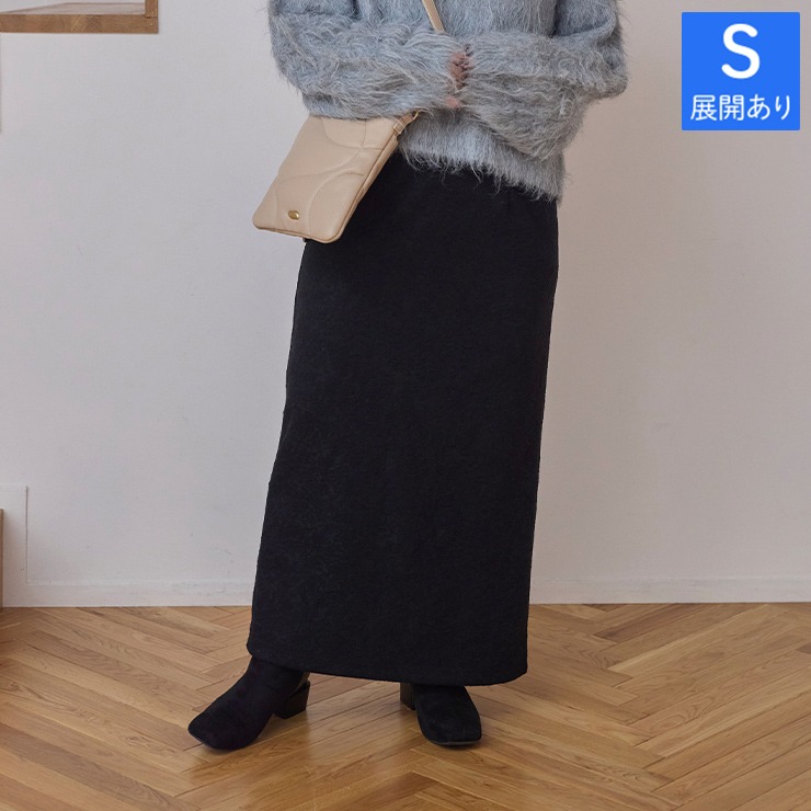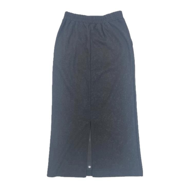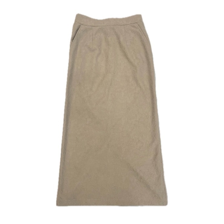 花柄レースの裏側にカットソー素材を貼り合わせたナロースカートです。中肉素材なので春までご着用いただけます。左右ポケット付き、後ろスリット入りで足さばきがラクです。