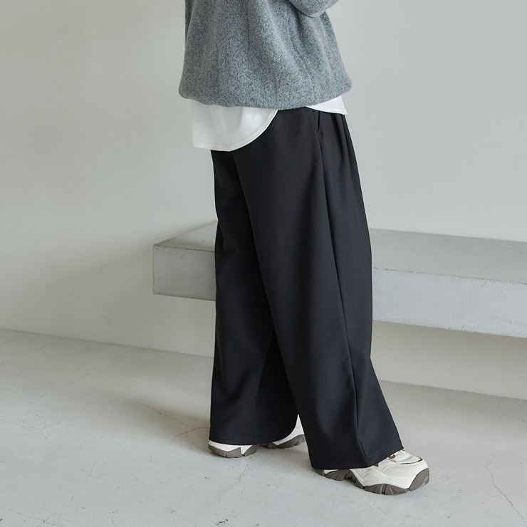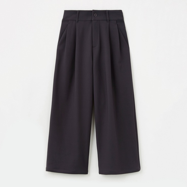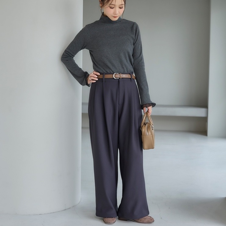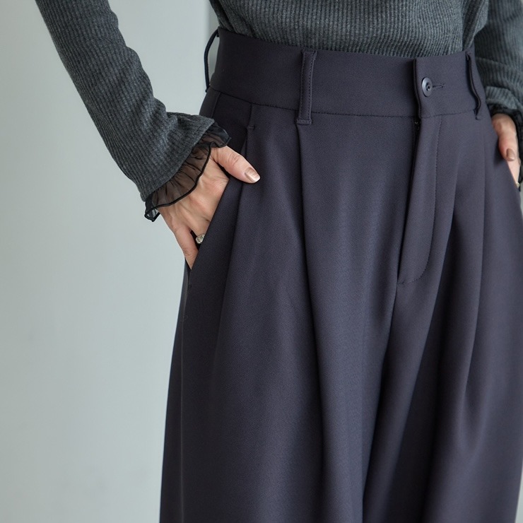 表側はジョーゼット素材、裏側に起毛感のある素材を貼り合わせたワイドパンツです。やや光沢のある素材なのできれいめにもカジュアルにも着こなせます。前ジップですが後ろに部分ゴムがあり、はき心地がラク。前左右にポケット付きです。
