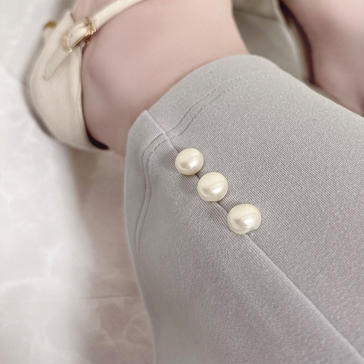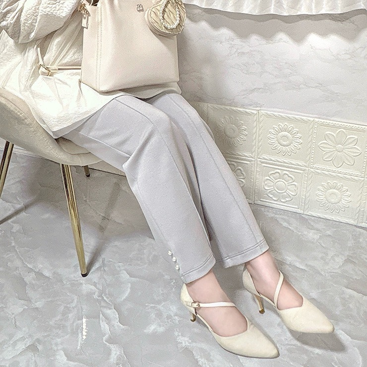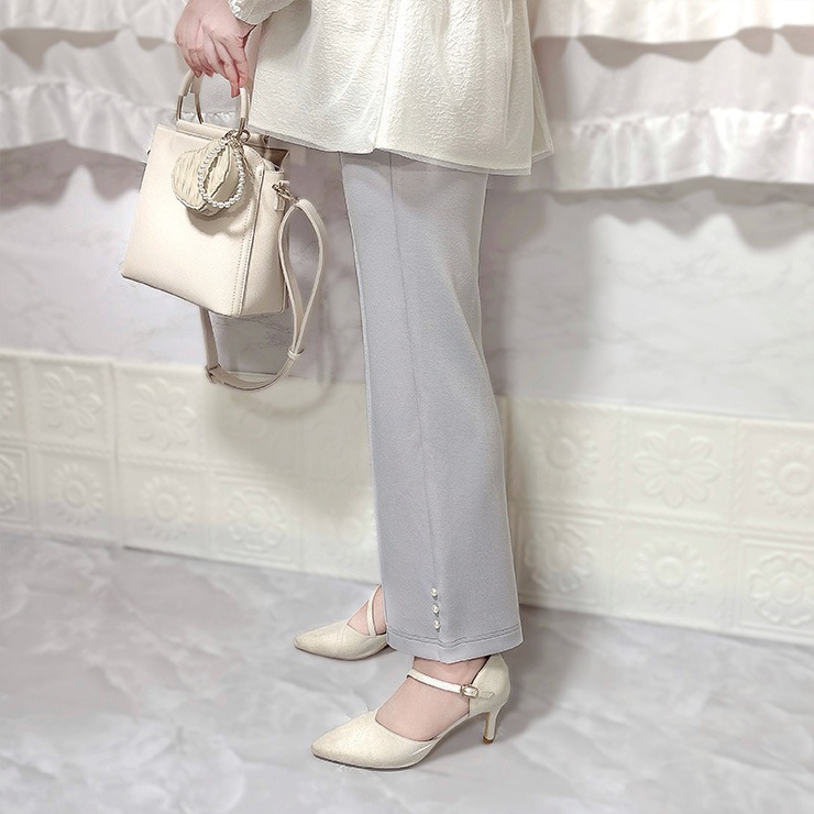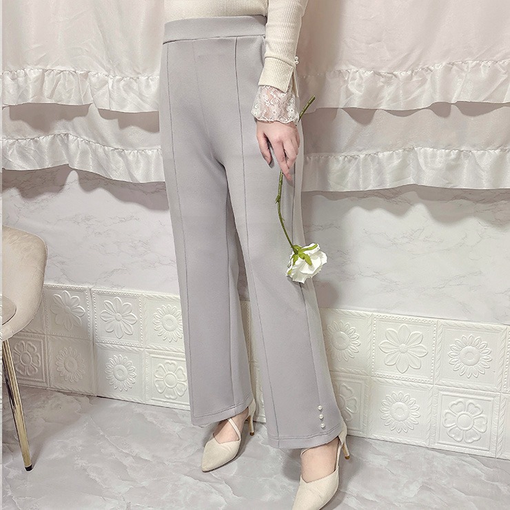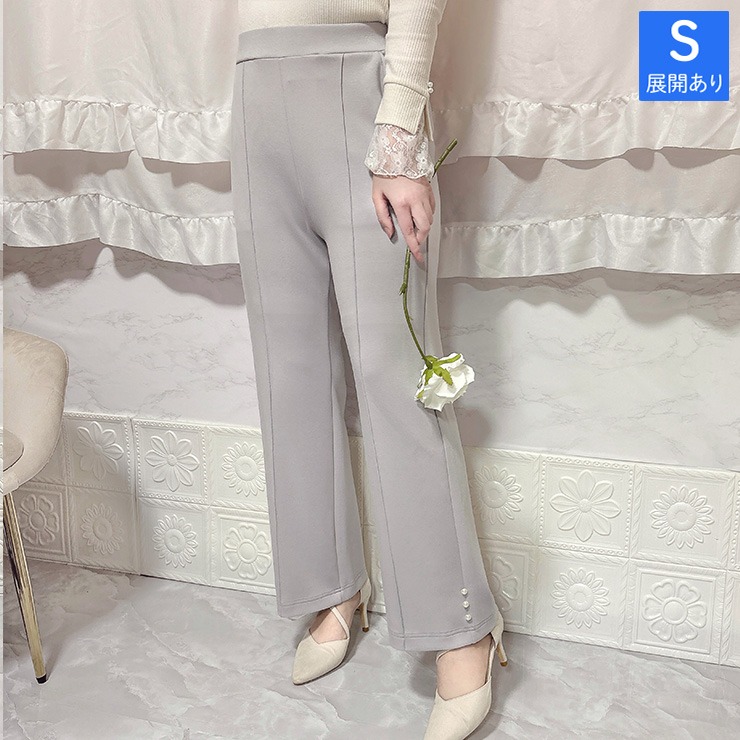 インフルエンサーCocoさんコラボ商品が新登場!柔らかくはき心地の良いダンボールニット素材のフレアパンツです。裾にパール風デザインが特長です。後ろゴム仕様でらくちん。左右ポケット付き。