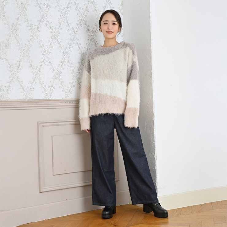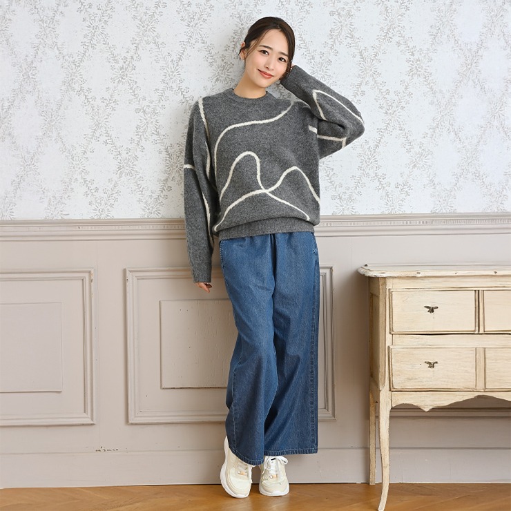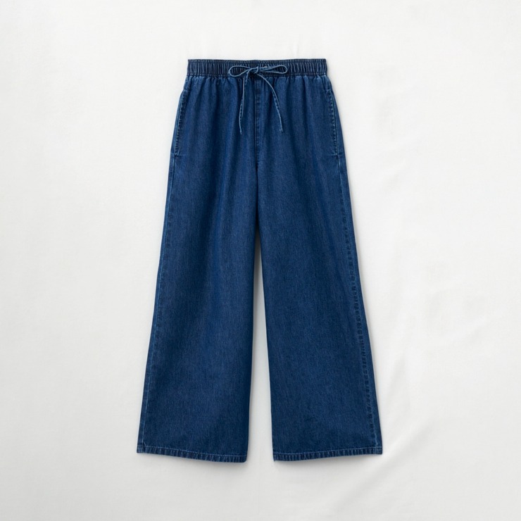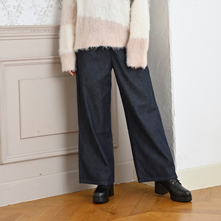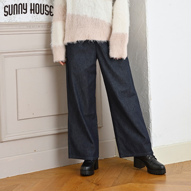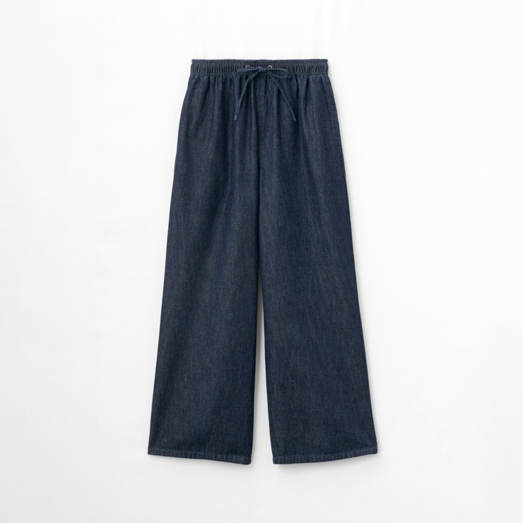 7.7OZの綿100デニムを使ったワイドパンツです。履くときれいなワイドストレートシルエット。 ウエスト総ゴム仕様です。 共地紐ベルトで調整可能です。 前側に左右ポケット付き。きれいなデニム素材なのでコーディネートがしやすいパンツです。 カラーは2色展開。サイズはM,Lの2サイズ展開。 秋のお出かけ等にも大活躍のパンツです。