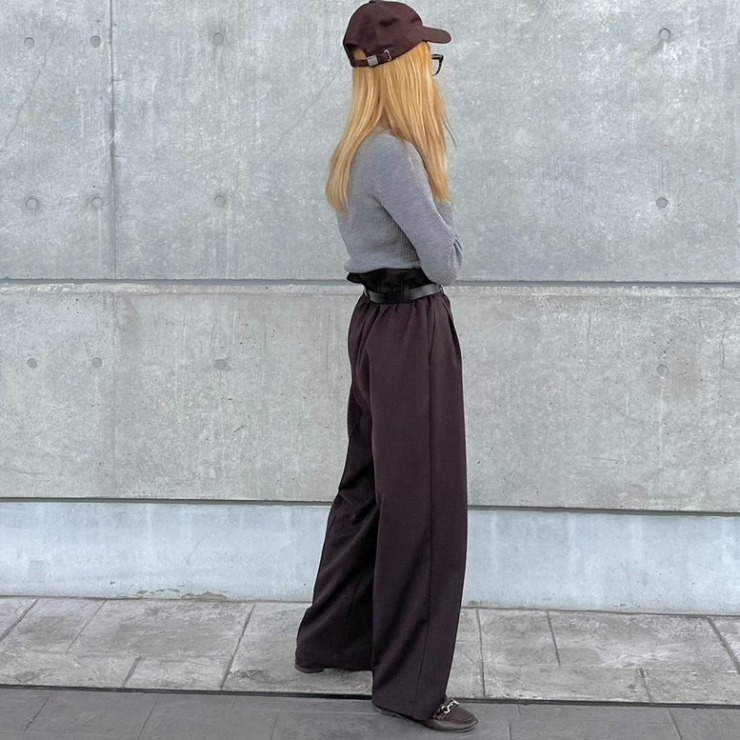 2タックデザインで腰回りをカバーしやすく、後ろはゴム仕様で着脱がラクです。