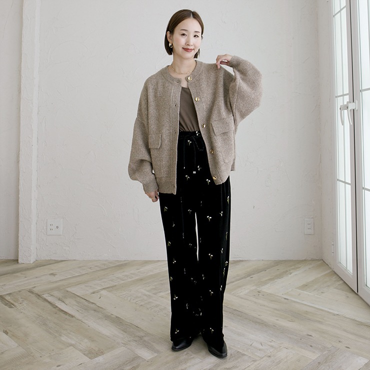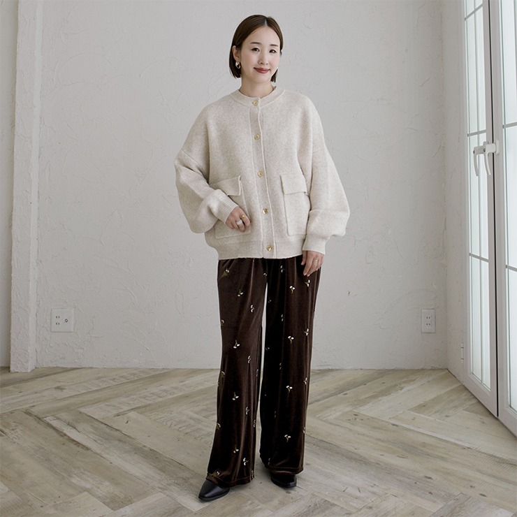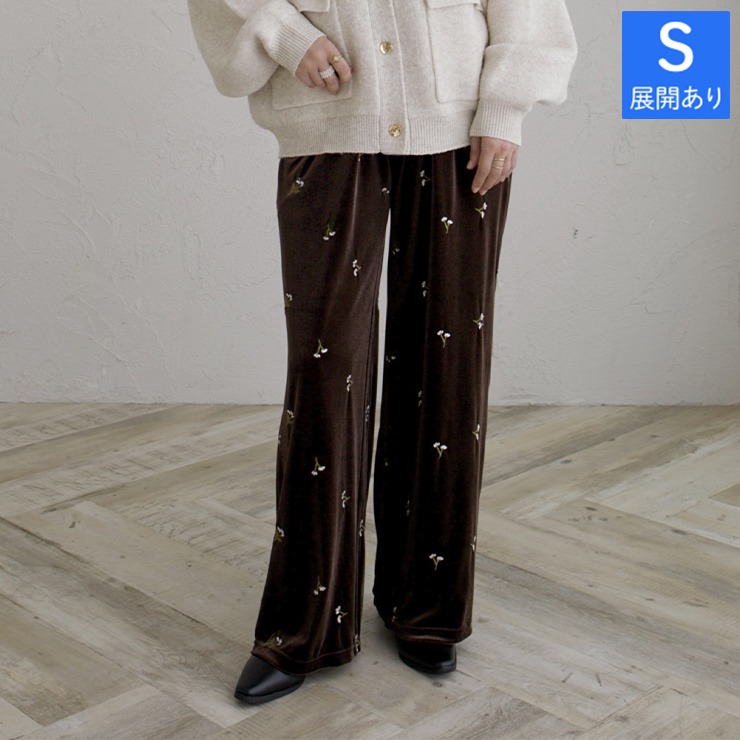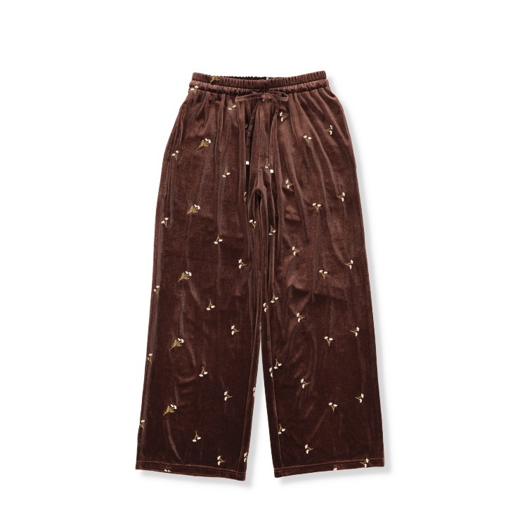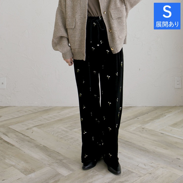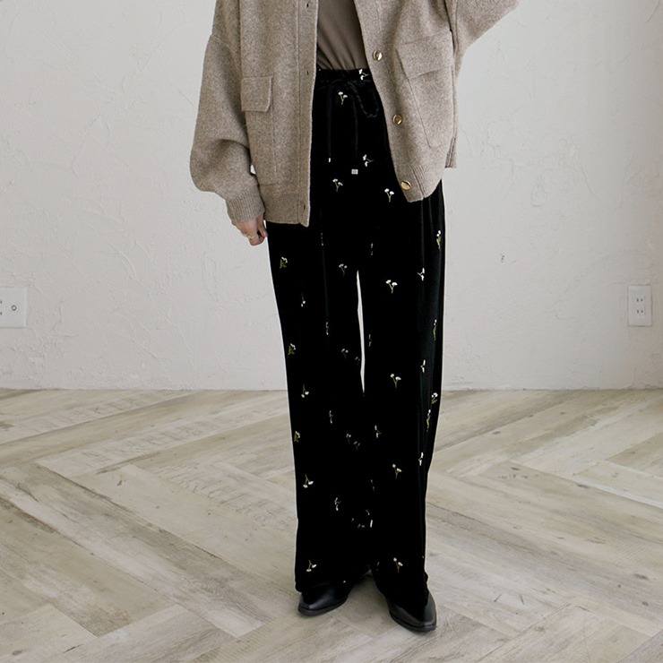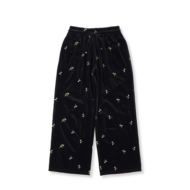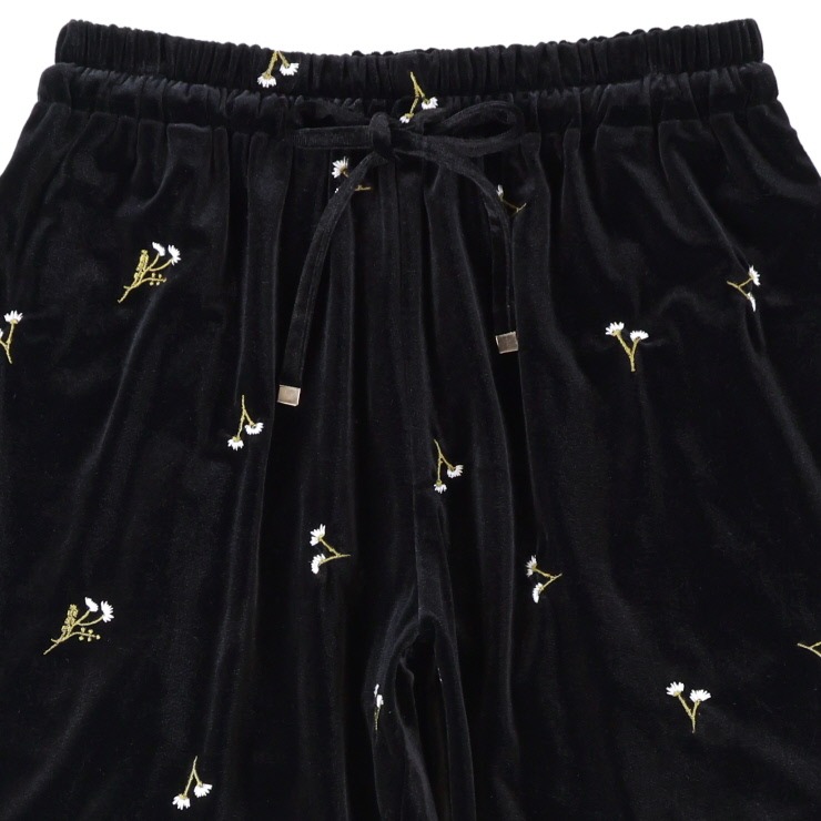 光沢がある、柔らかいベロア素材を使用したリラクシングパンツです。 全体に小花刺繍を散りばめた大人感のあるアイテム。 ウエストゴムのドロスト紐を調節することができ、締め付け感の少ない心地よい着心地です。