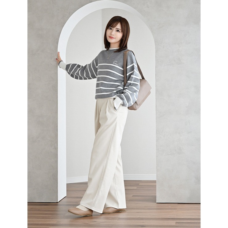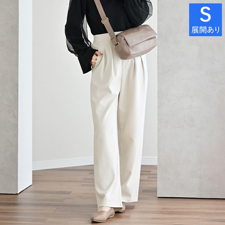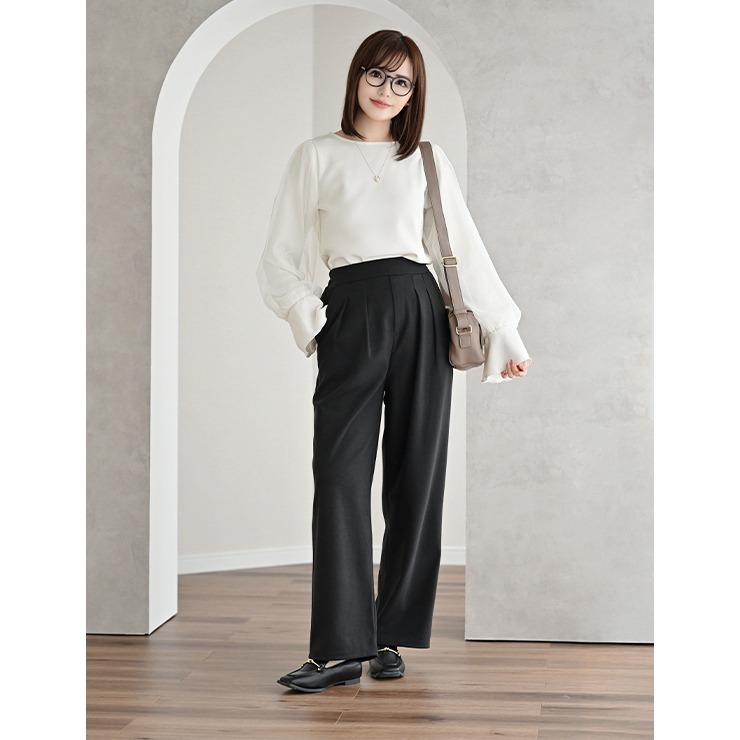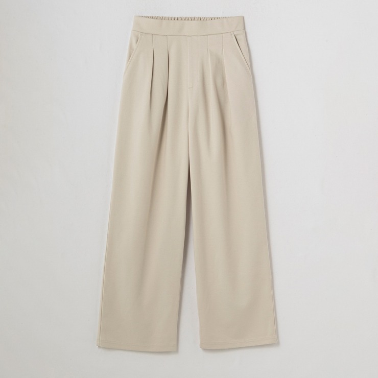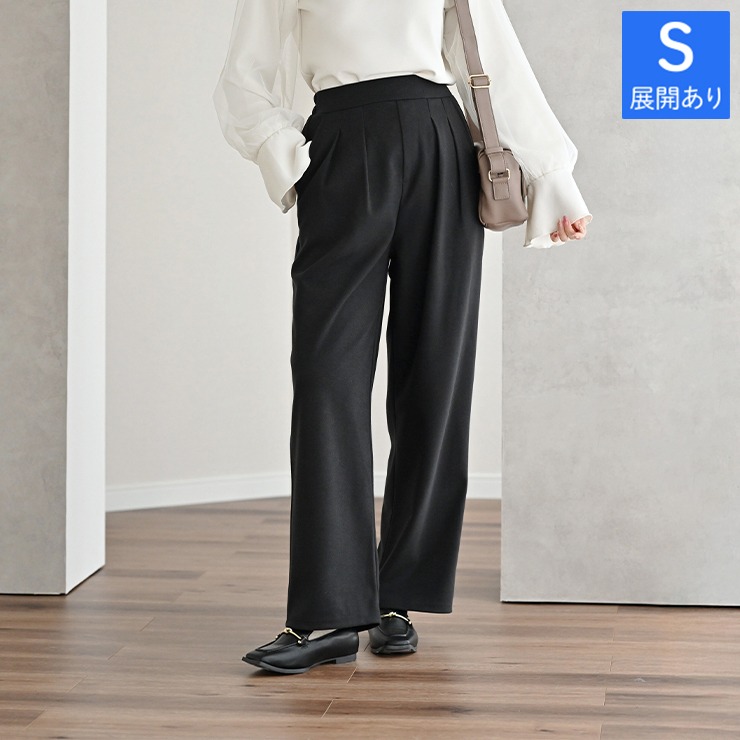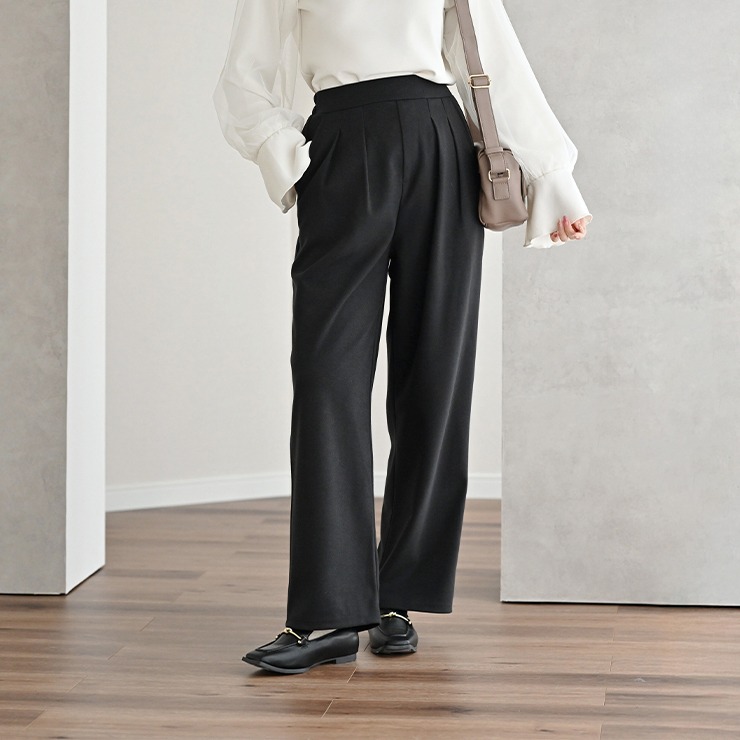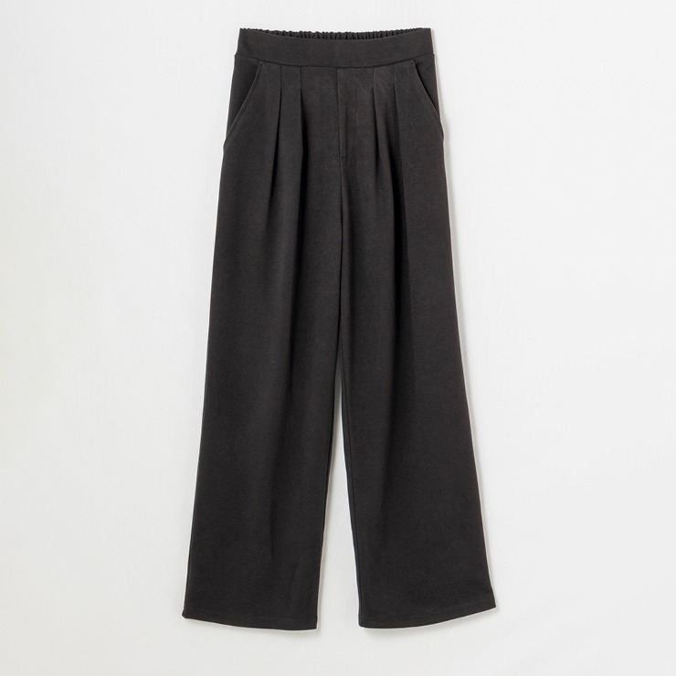 温かみのある表起毛素材のカットソーを使用したタックワイドパンツです。タックデザインでおなか周りのシルエットをカバーし、後ろゴム仕様で着脱がラクです。左右ポケット付き。