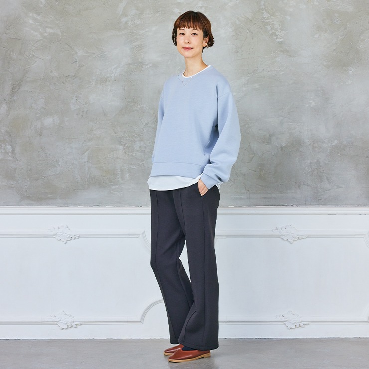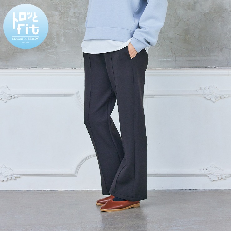 とろっとした肌触りと、自然と身体にフィットする着心地が特長のピンタックフレアパンツです。