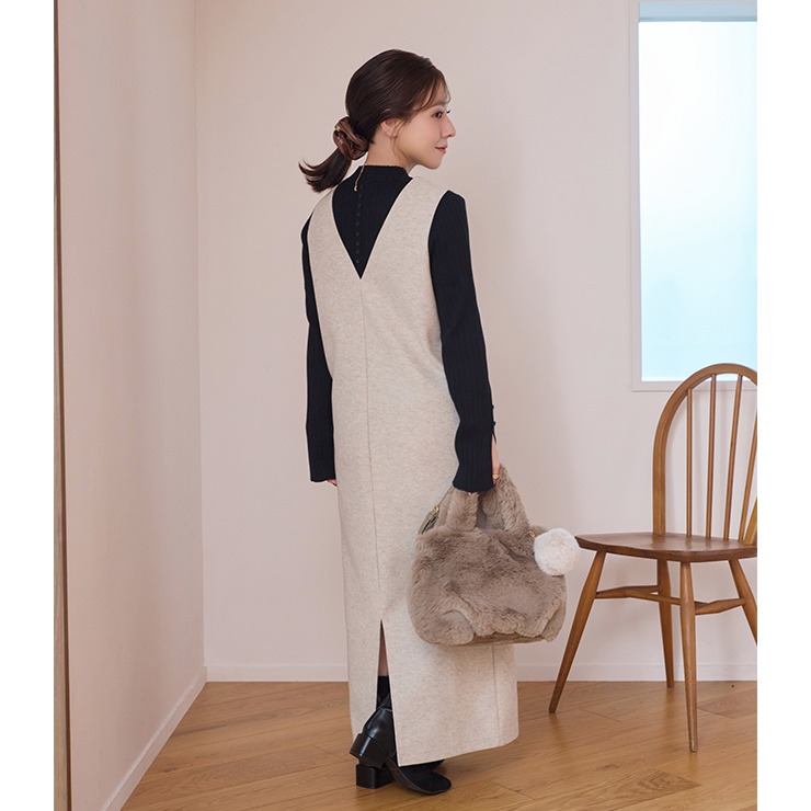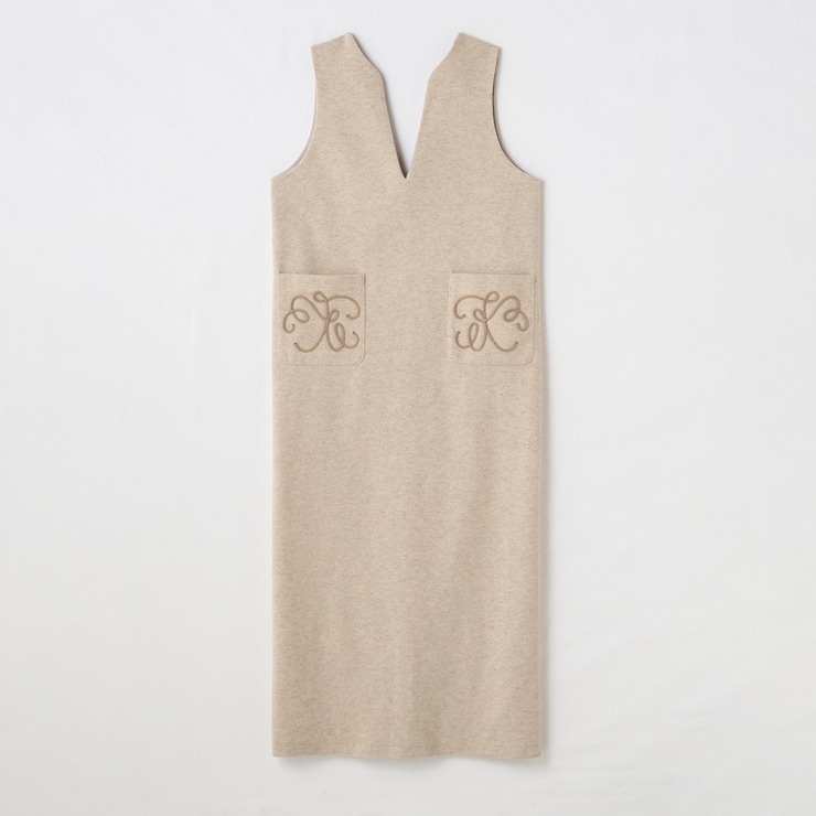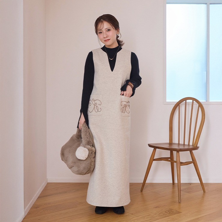 ポケットにコードたたきデザインのジャンパースカート。風合いのやわらかな素材を仕様し、後ろ裾にスリットがあるため歩きやすい。