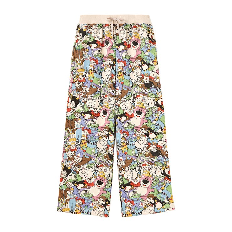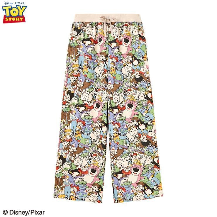 トイ・ストーリーのアイコン総柄のリラクシングパンツです。