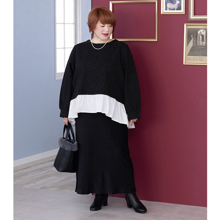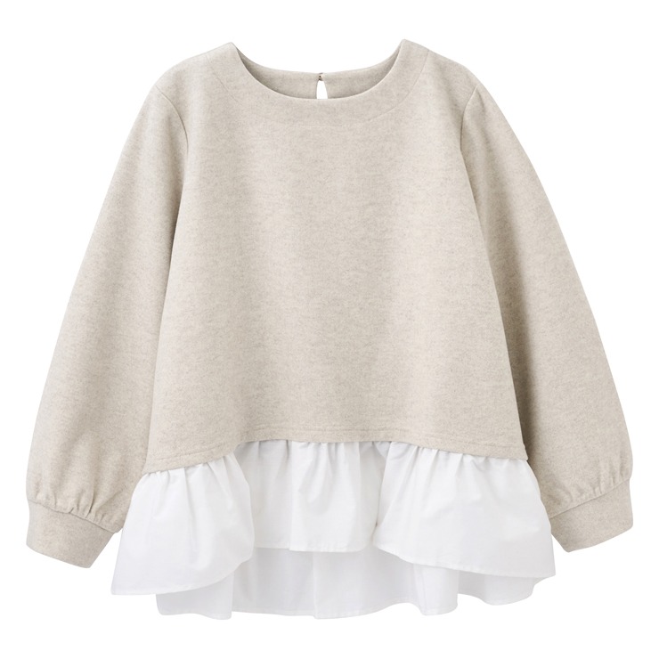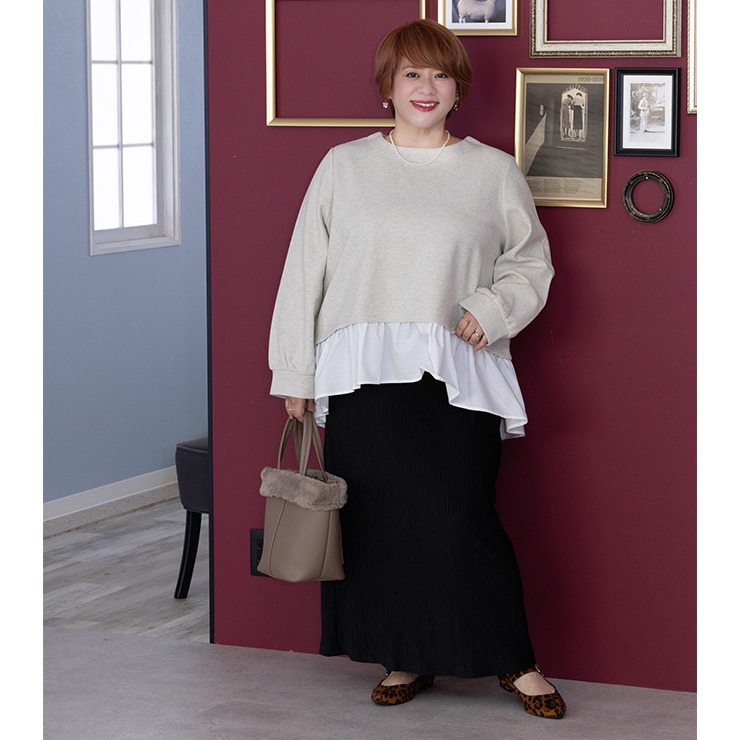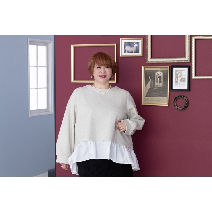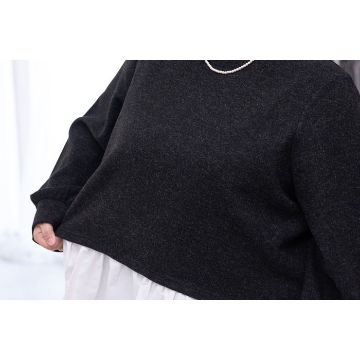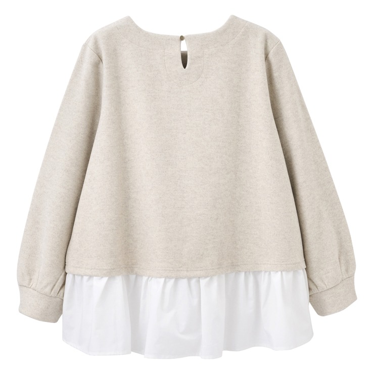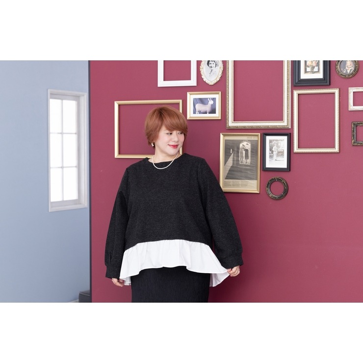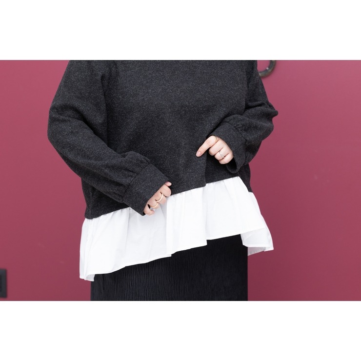 柔らかな起毛ポンチ素材と、布帛素材をドッキングさせたレヤード風トップスです。ゆとりのあるサイズ感で裾のペプラムフリルが自然に体型カバーしてくれます。1枚でサマになるデザインなので、シンプルなボトムともコーディネートしやすいです。