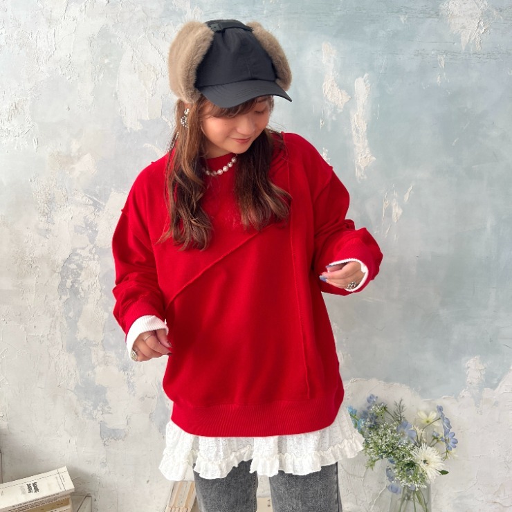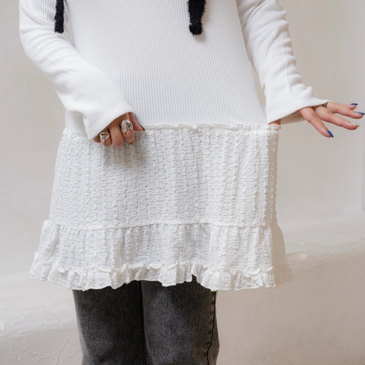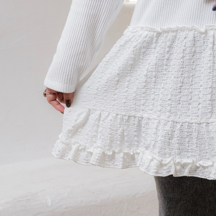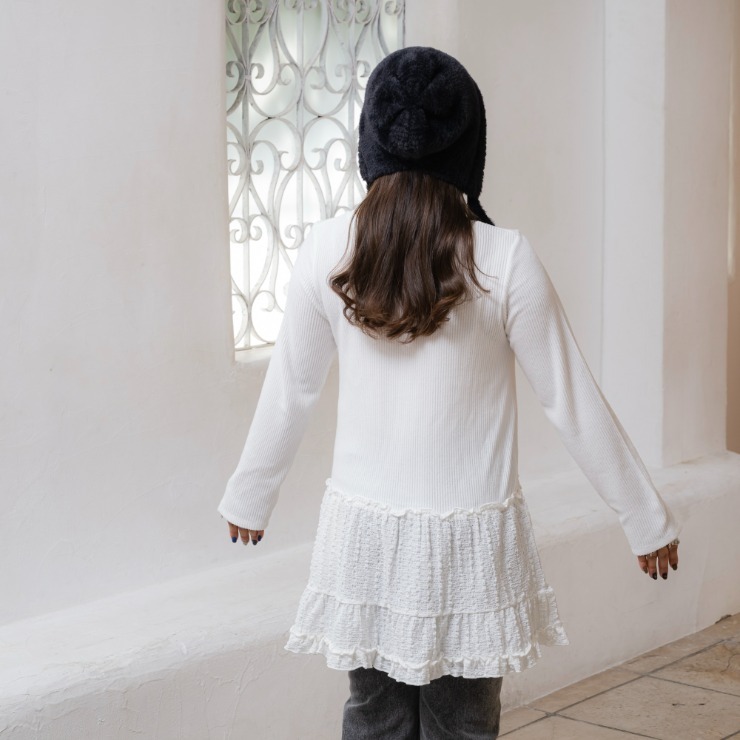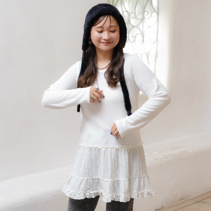 長袖のあたたかいリブ素材を使用し、裾にはふわっと揺れる異素材生地を使用しております。