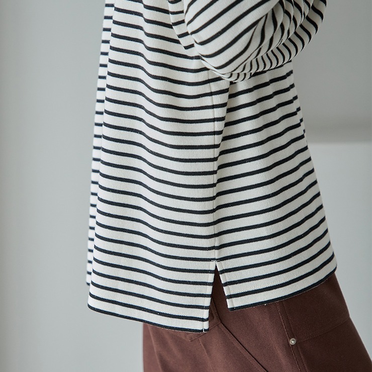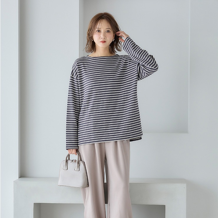 シンプルな配色でどんなスタイリングにも合わせやすいボーダートップスです。程よく厚みのある素材感なのでロングシーズン活躍します。ゆとりのあるシルエットでボトムを選ばず幅広いコーディネートを楽しめます。