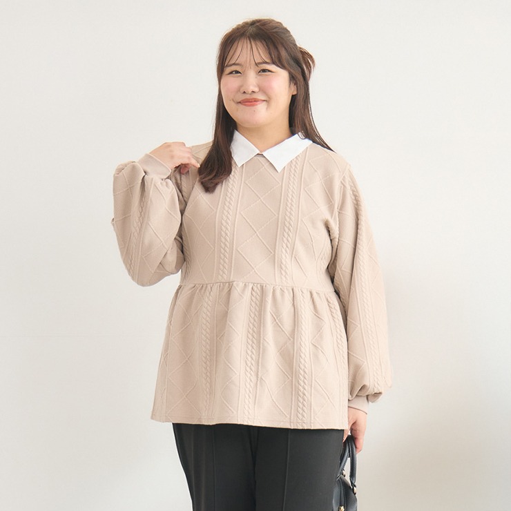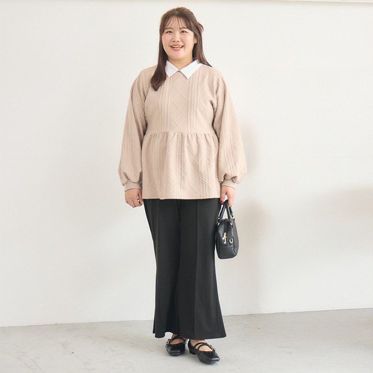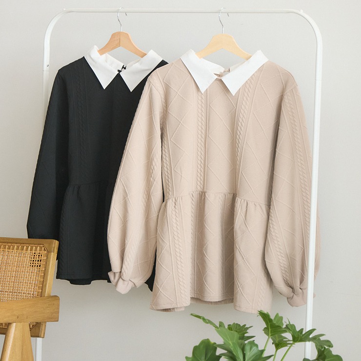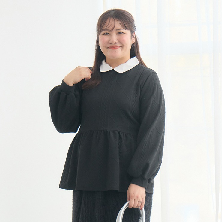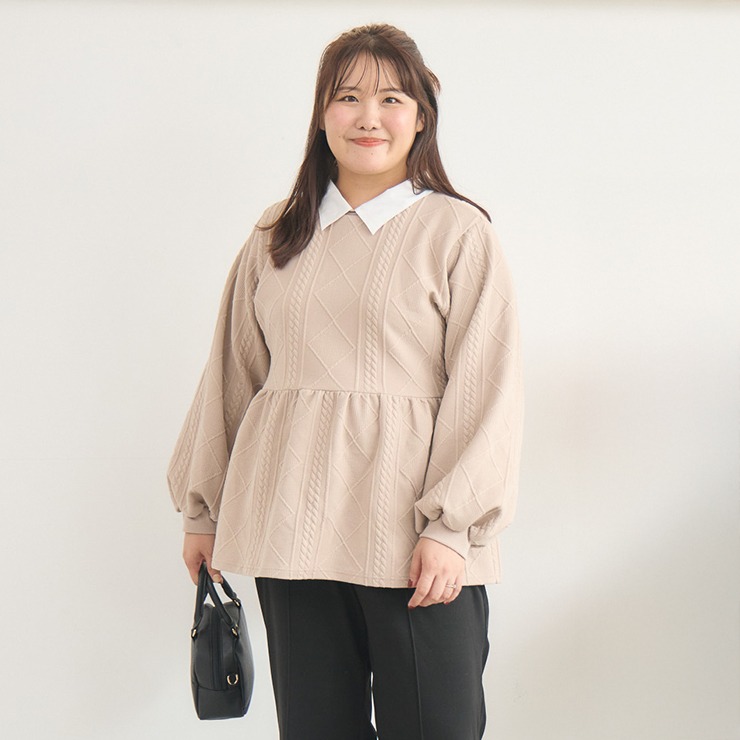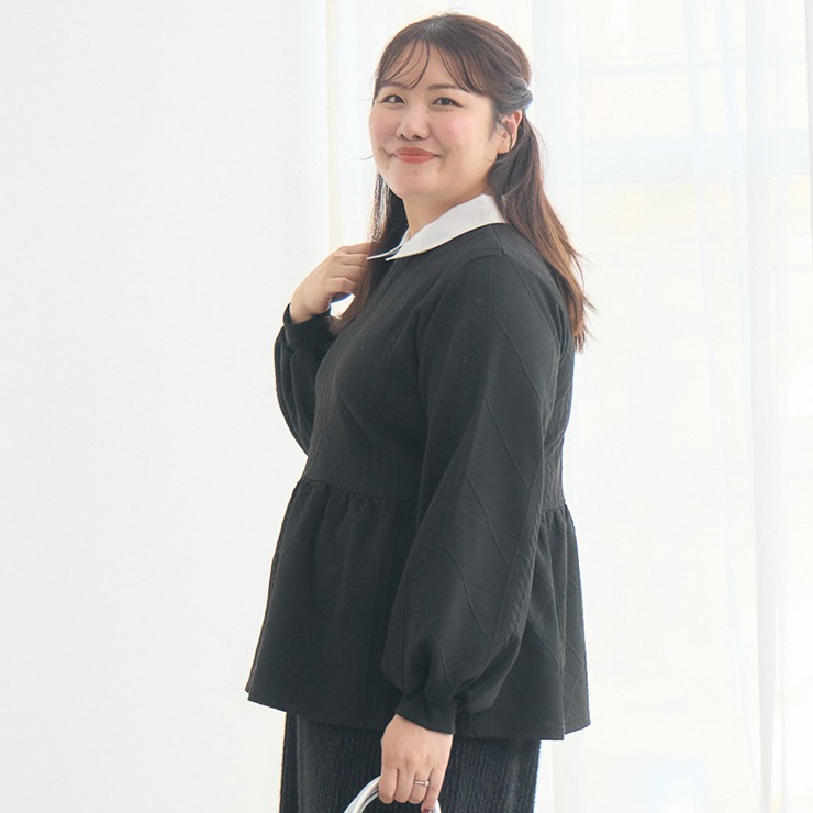 表面感のある膨れジャガード素材のペプラムシルエットのプルオーバーです。