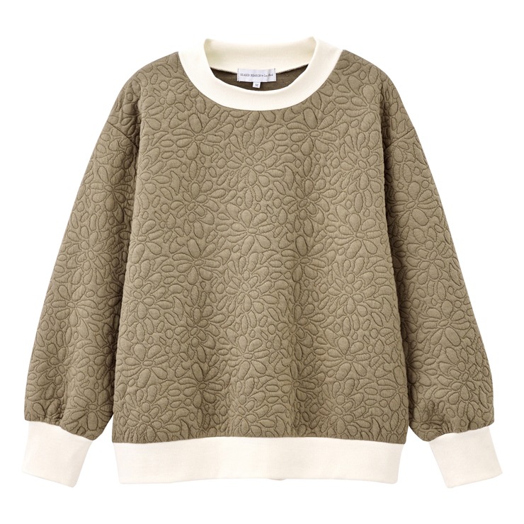 今トレンドの配色切替のデザインで、落ち着いたカーキカラーに、白いリブがアクセントを添え、さりげないおしゃれを演出します。ゆったりとしたシルエットが、リラックスした着心地を叶えてくれます♪
