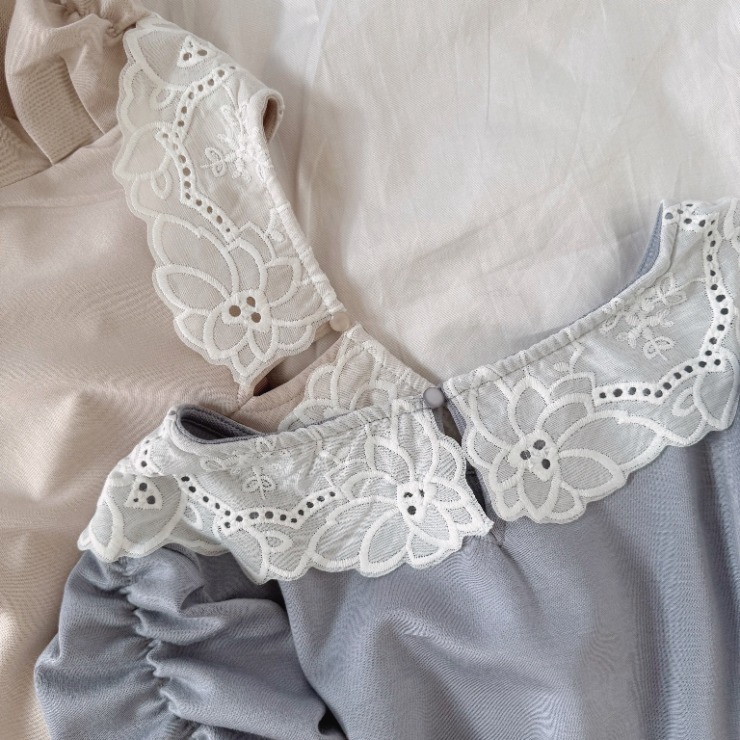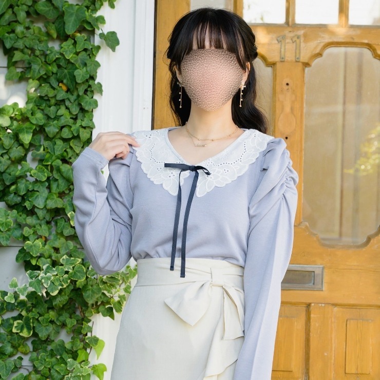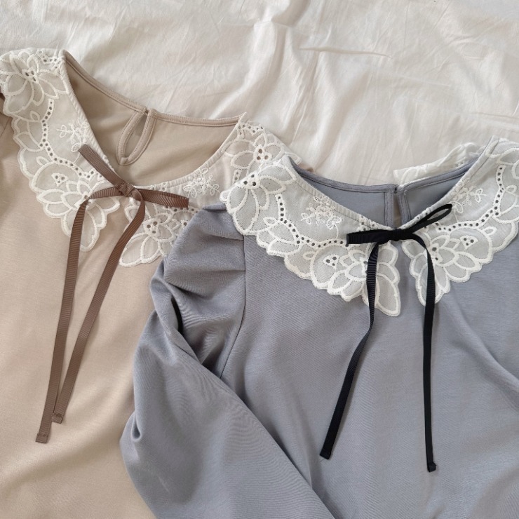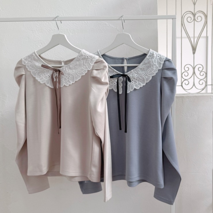 レース素材を用いた衿が特徴的なプルオーバー。