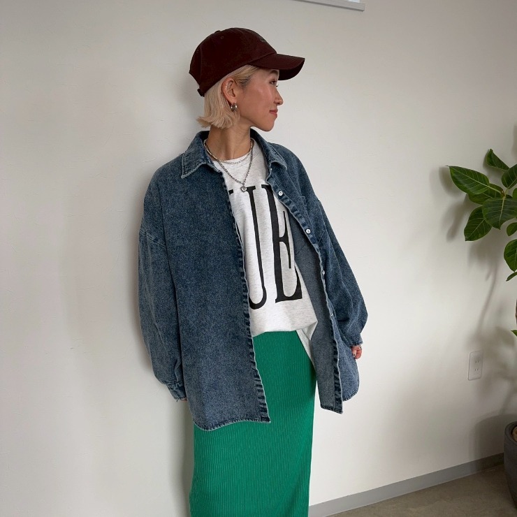 たっぷり落とした肩のラインとゆるいビッグシルエットが大人カジュアル
