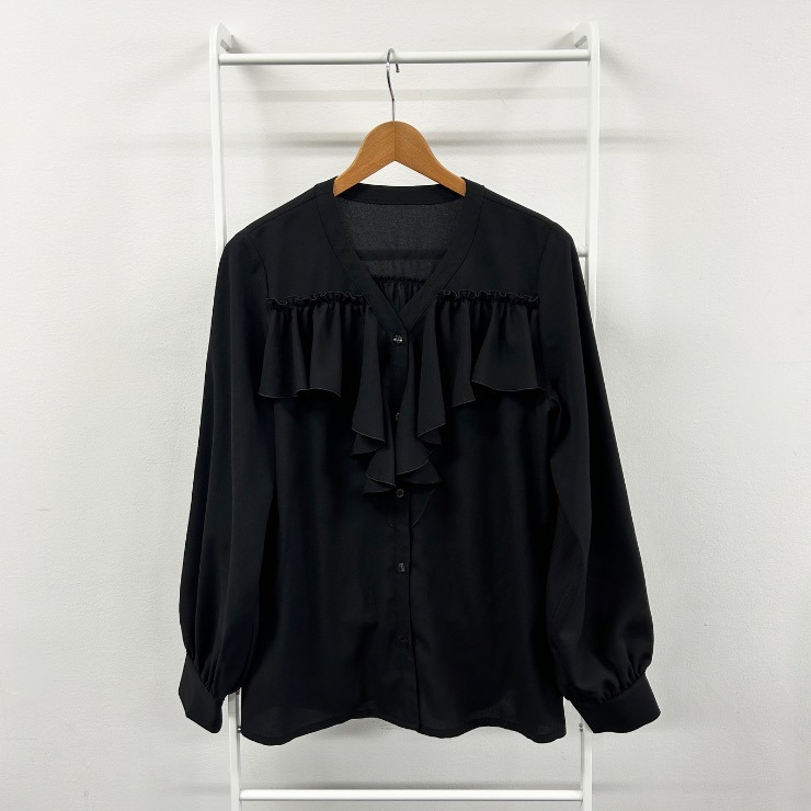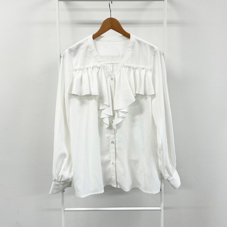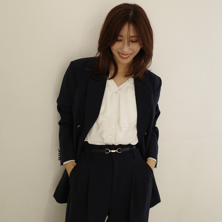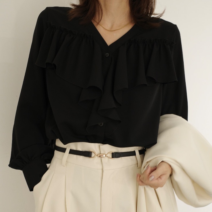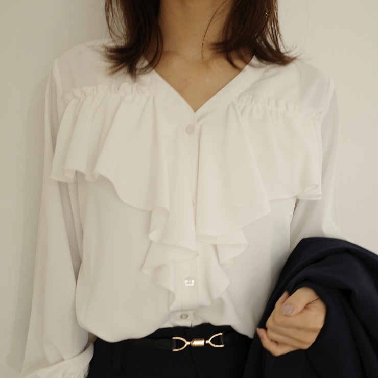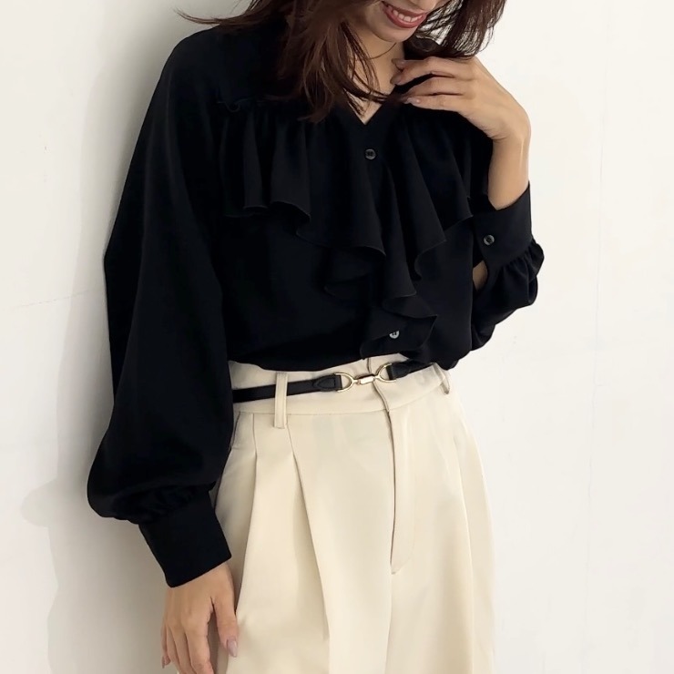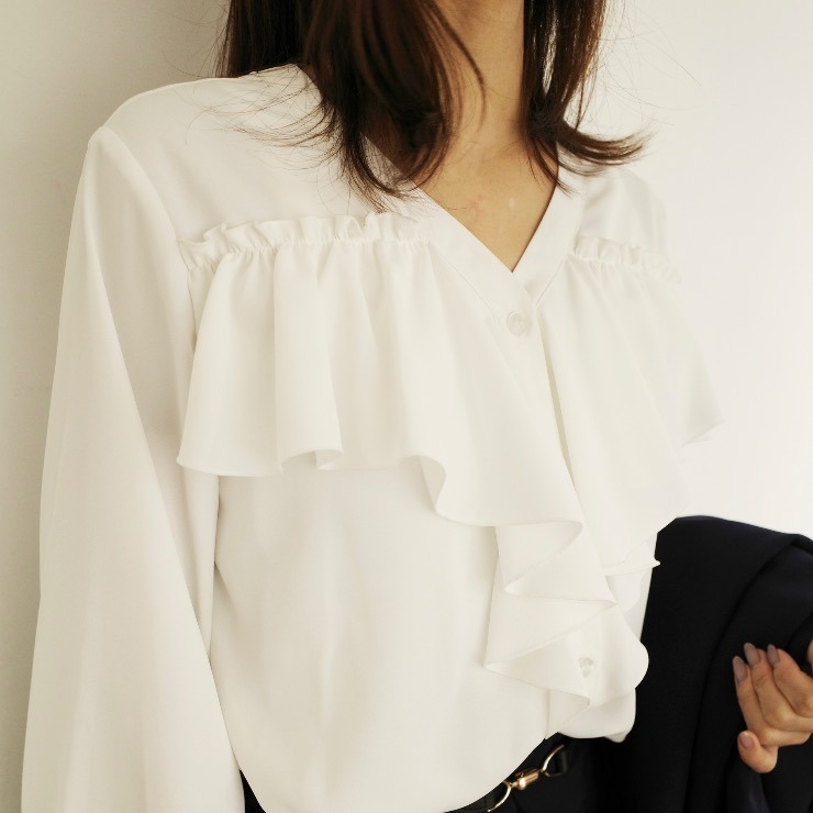 トレンドのラッフルブラウスを大人もおちついた着やすいデザインに。