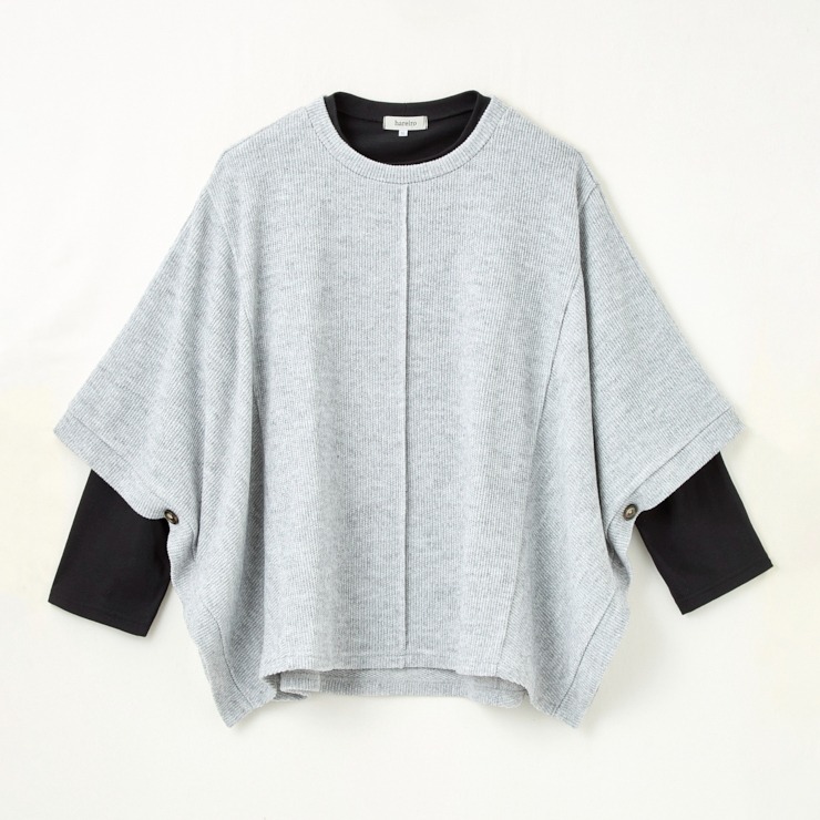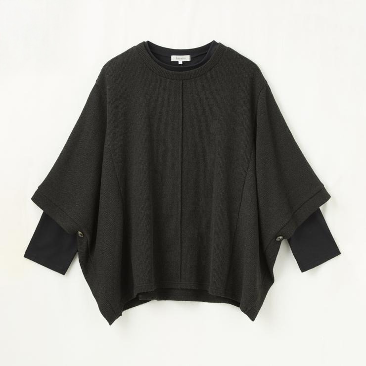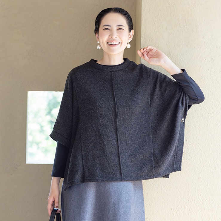 切り替えデザインを活かしたポンチョ型プルオーバーは、体型カバーとおしゃれ見えの両方を叶えてくれる一押しのアイテムです。