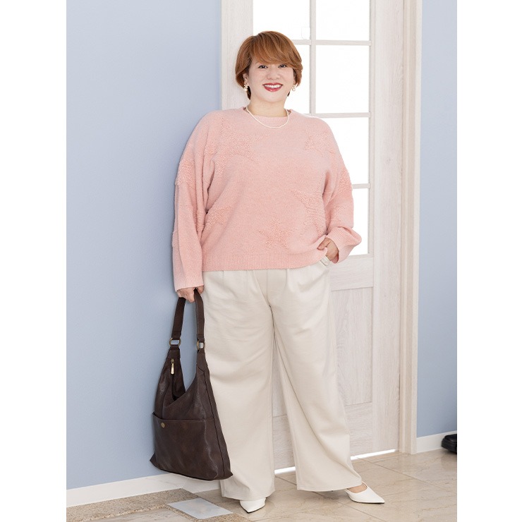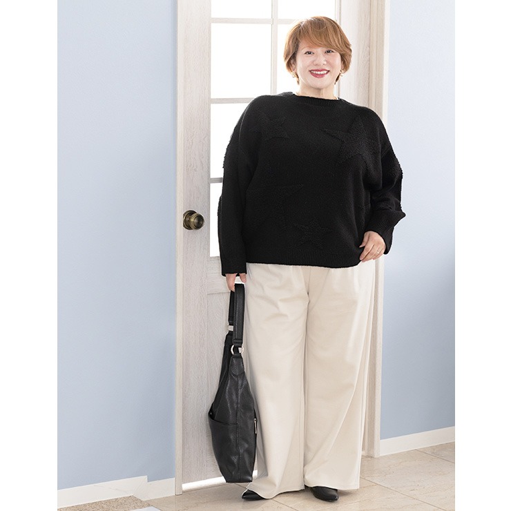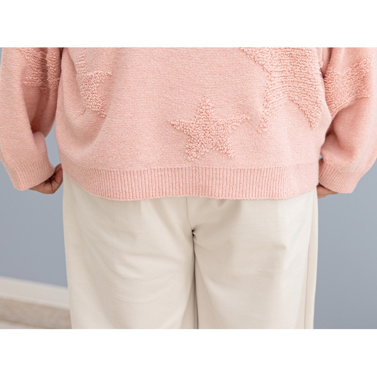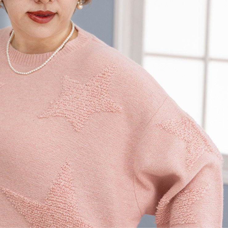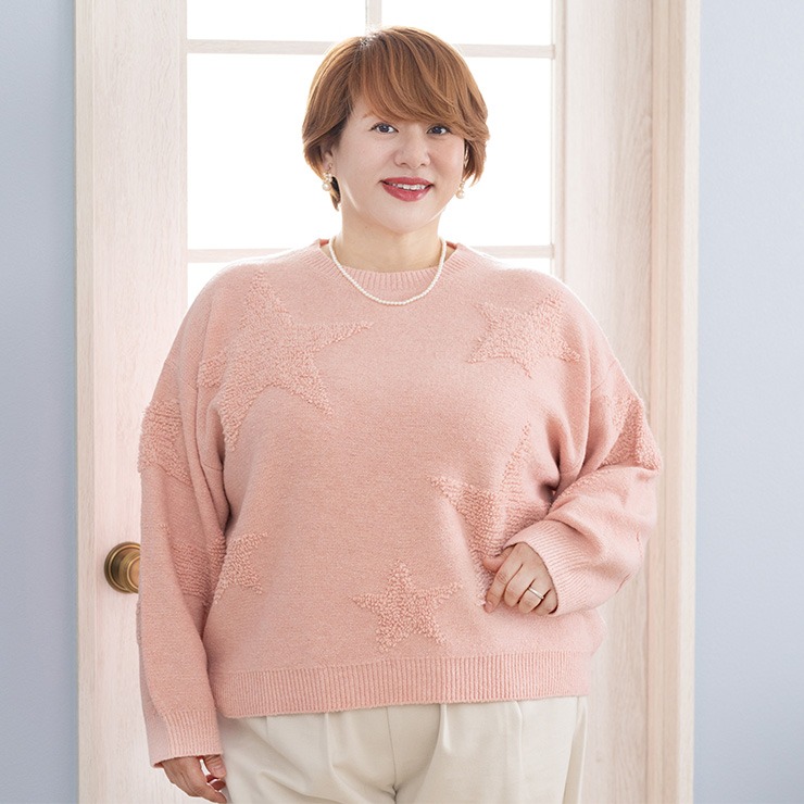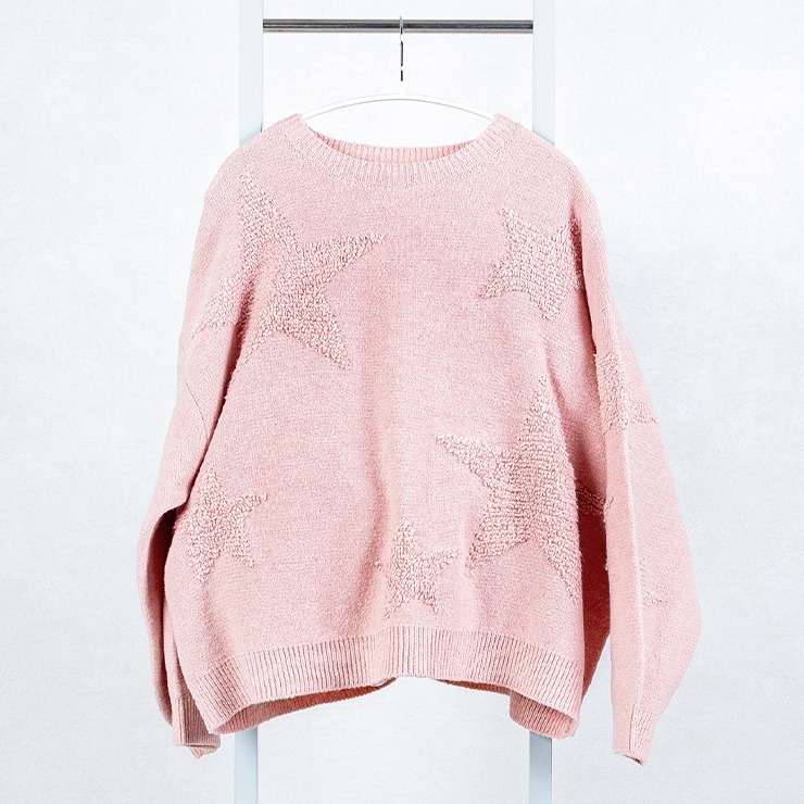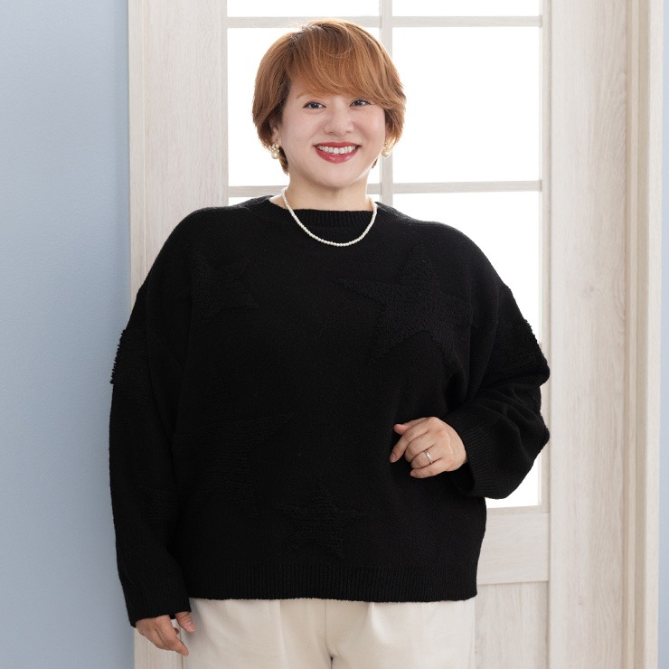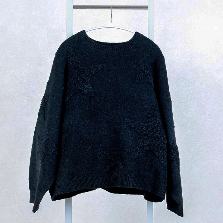 立体感のあるループ編みの星柄ジャカードなので同色柄でも目を惹き、着やすい1枚に仕上げました。