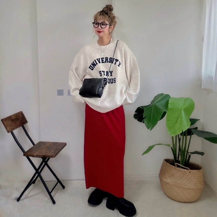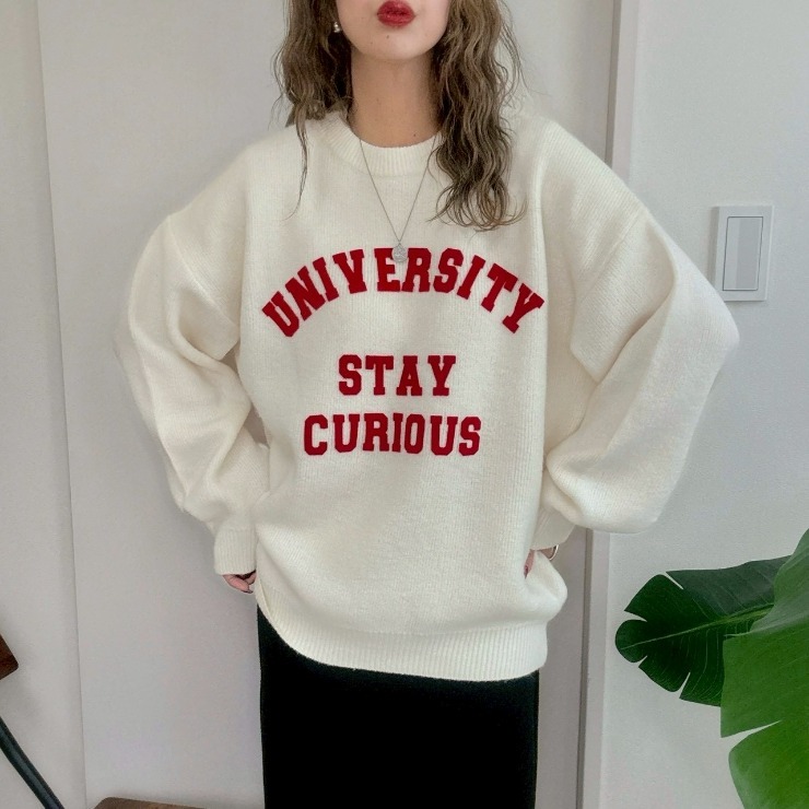 カジュアルなロゴデザインがアクセントになり、ナロースカートやカーブパンツにとも好相性。