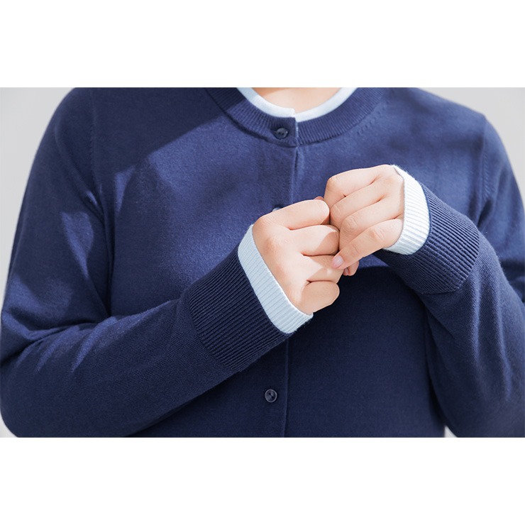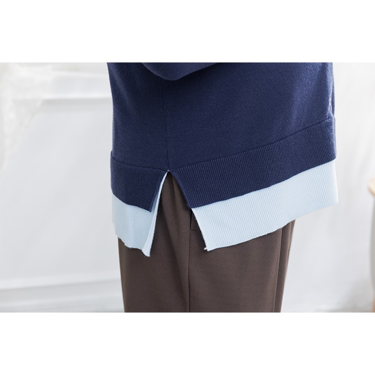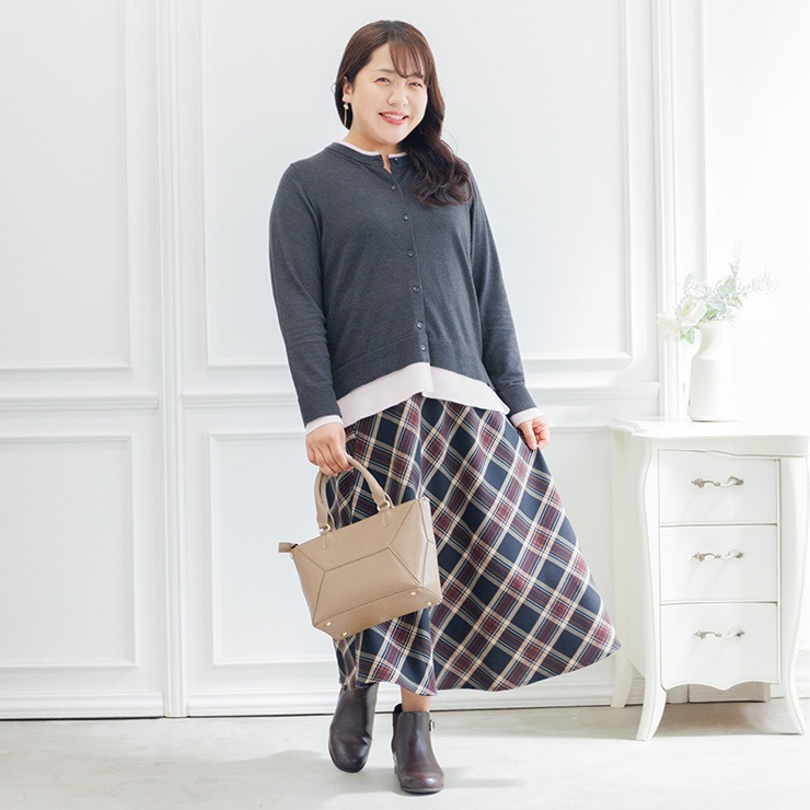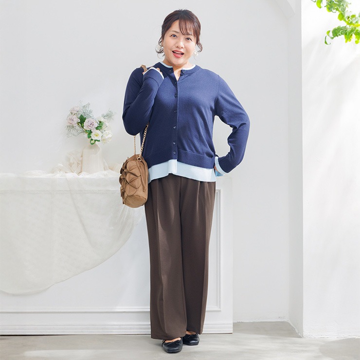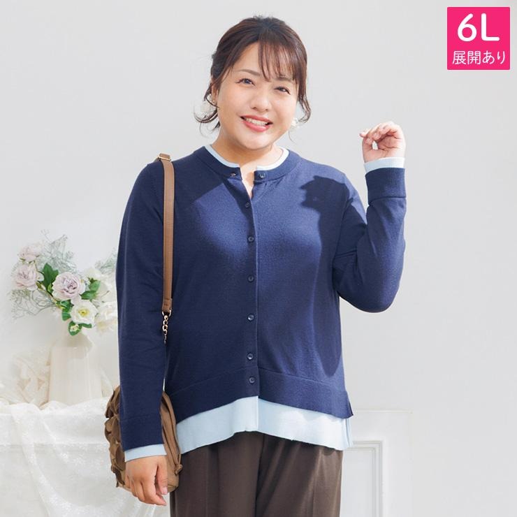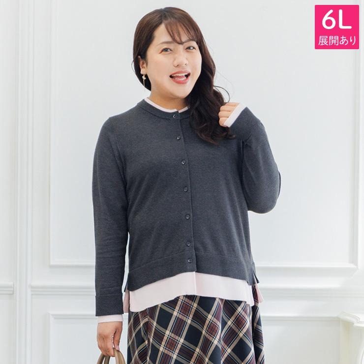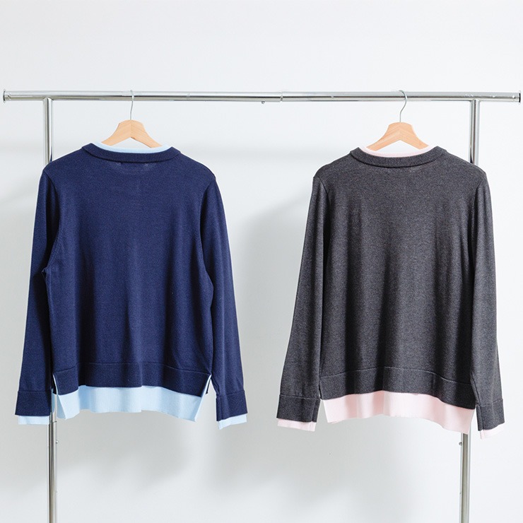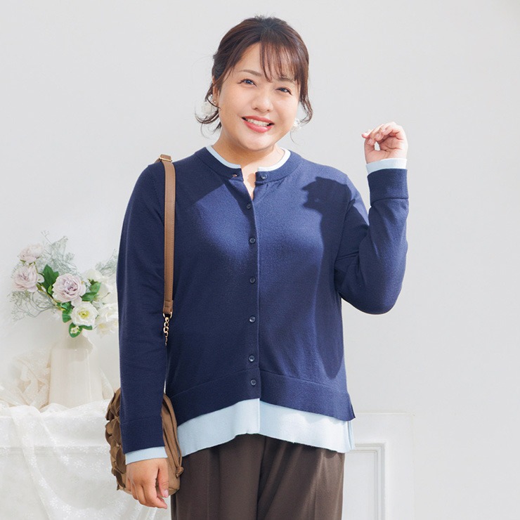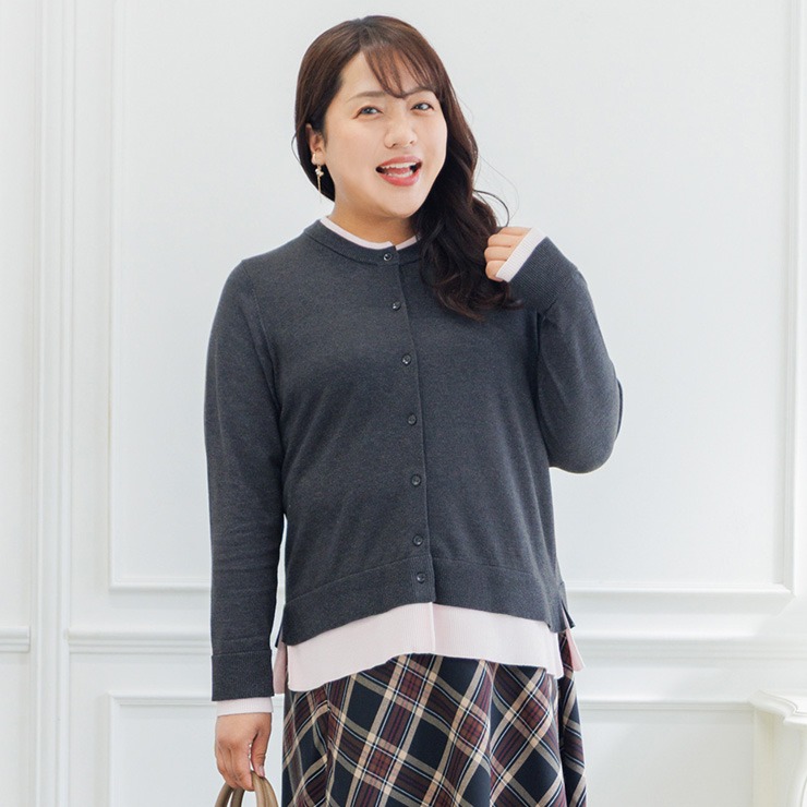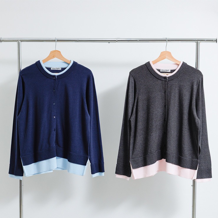 トレンドの配色レイヤード風のニットカーディガン。1枚で今年らしいコーディネートが完成します。