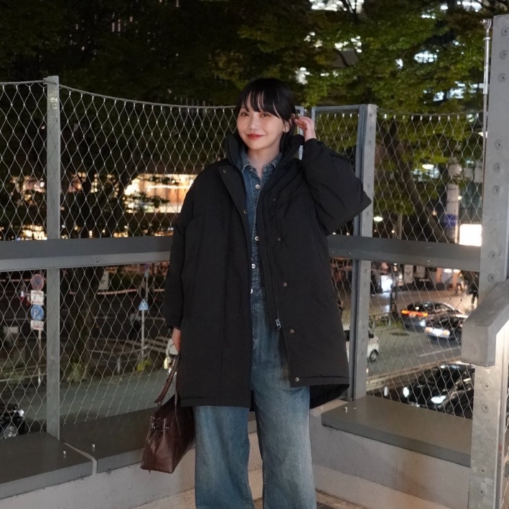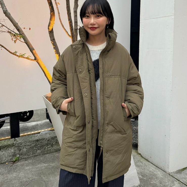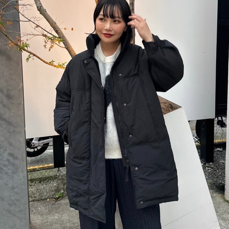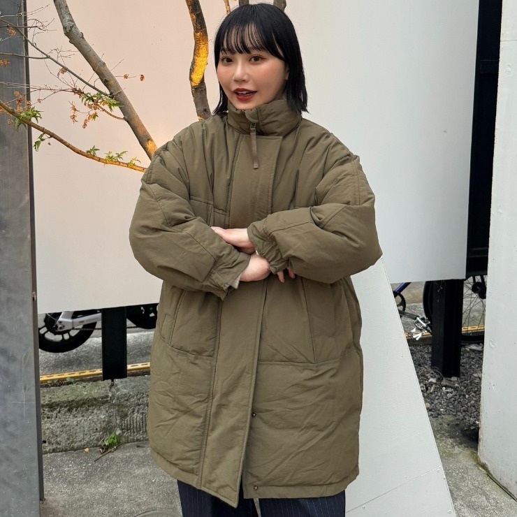 オーバーなシルエットが特徴的な中綿コート。
